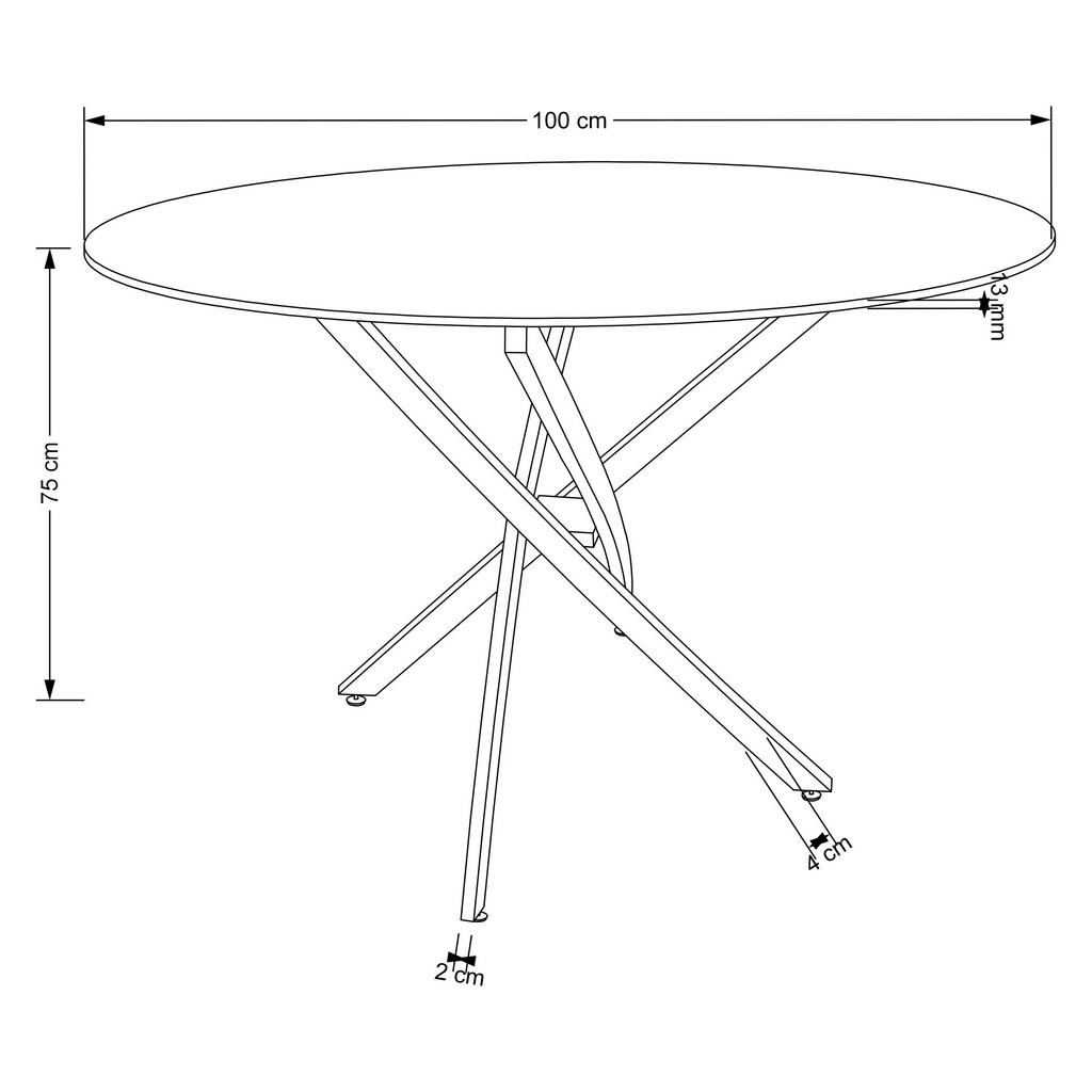 Stolová doska má tvar kruhu s priemerom 100 cm. Vyrobená je zo skla o hrúbke 13 mm, vďaka čomu je odolná voči poškriabaniu a odstrániť z nej prípadné nečistoty bude hračka.