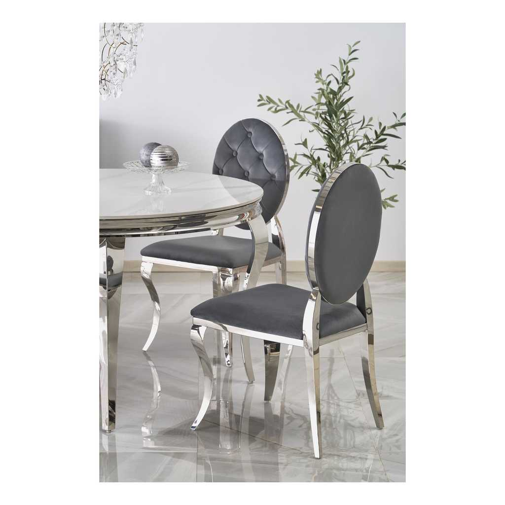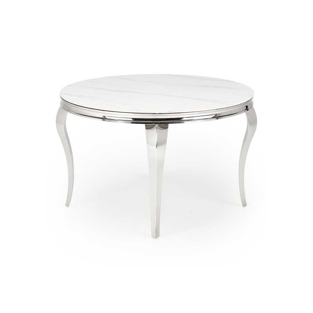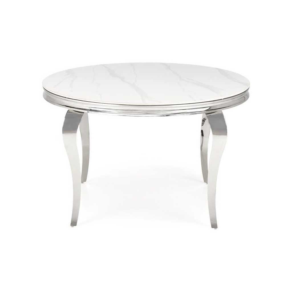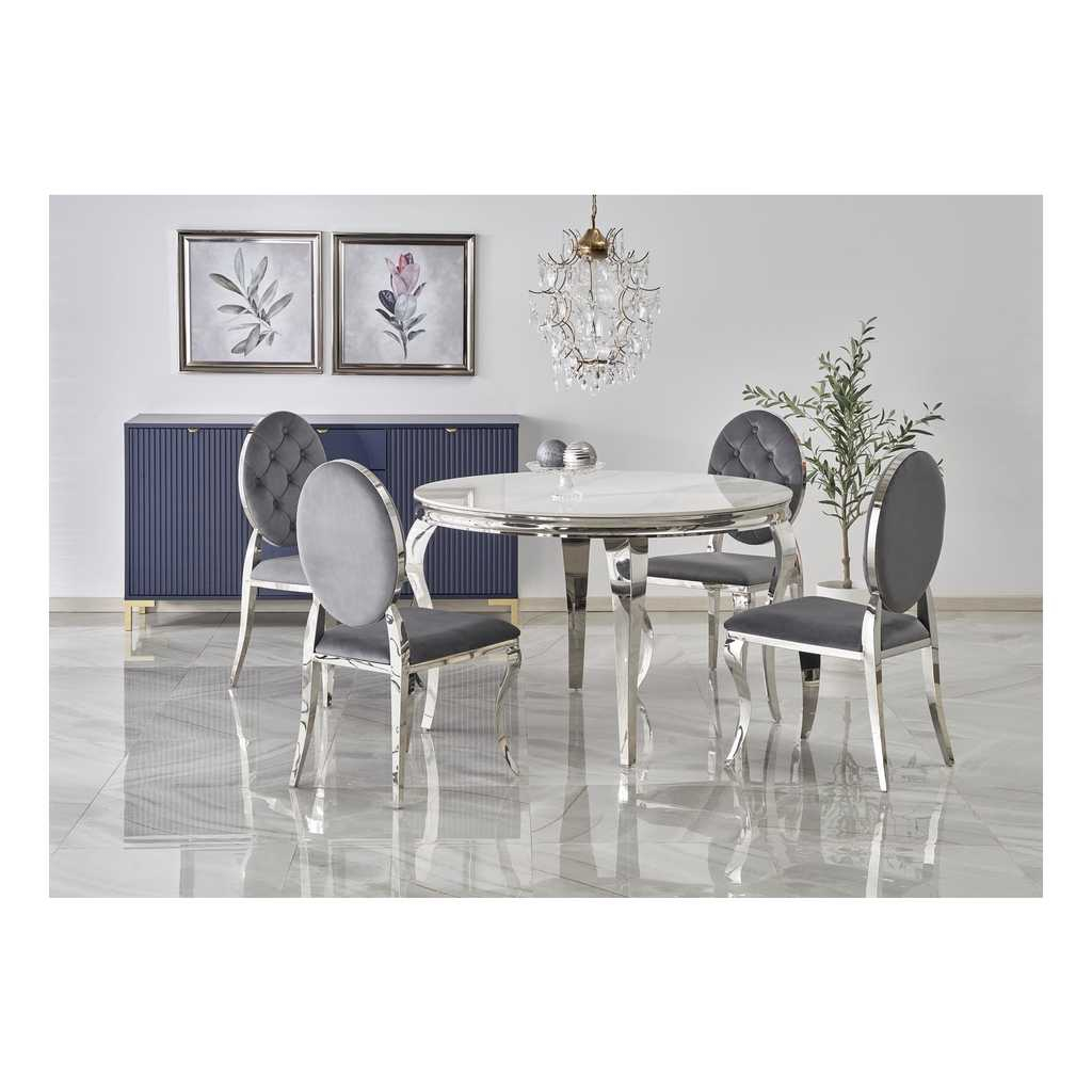 Kontrastné nohy z nehrdzavejúcej ocele s rafinovanými krivkami nielenže podčiarkujú modernú estetiku stola, ale zabezpečujú aj jeho stabilitu a pevnosť. Spolu celok pripomína nábytok šľachtického sídla.