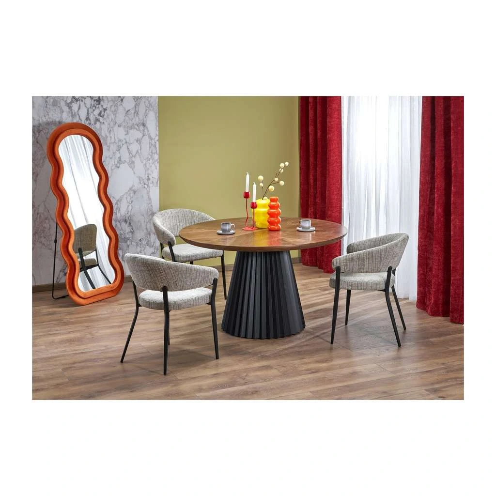 Jedálenský stôl Tirgia ponúka štýlový a funkčný doplnok do každej jedálne či kuchyne. Jeho okrúhla horná doska z kvalitného dreva vytvára príjemnú atmosféru pre rodinné stretnutia alebo večere s priateľmi. Moderná centrálna kovová podnož je nielen stabilná, ale aj dizajnovo zaujímavá, čo robí tento stôl skutočným pútačom pozornosti.