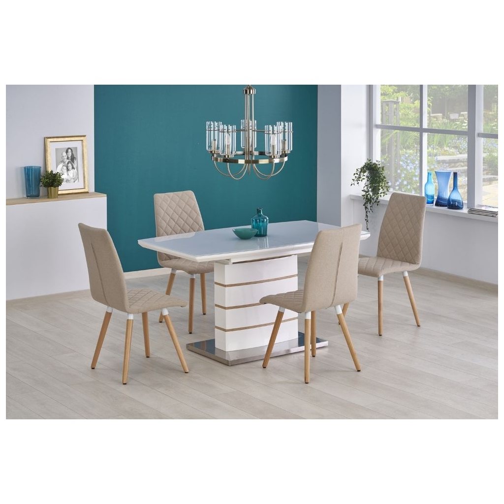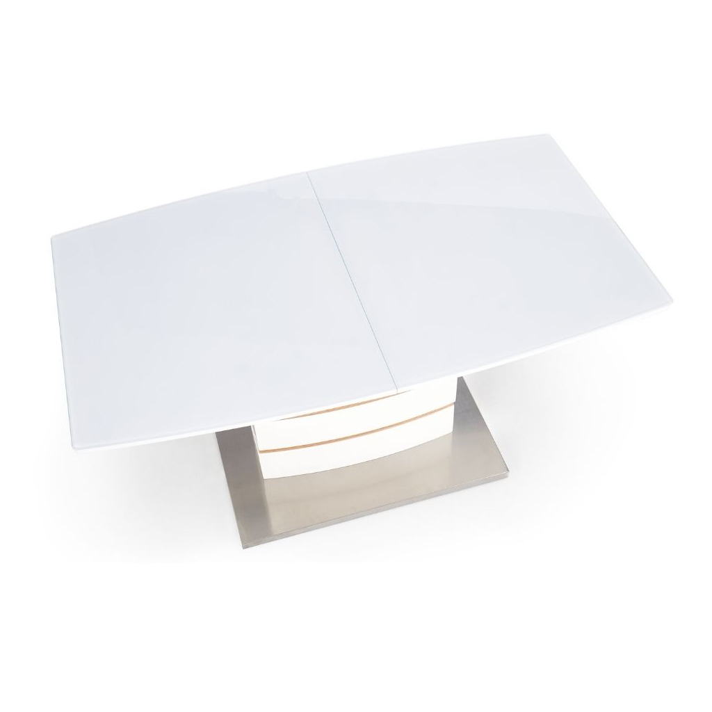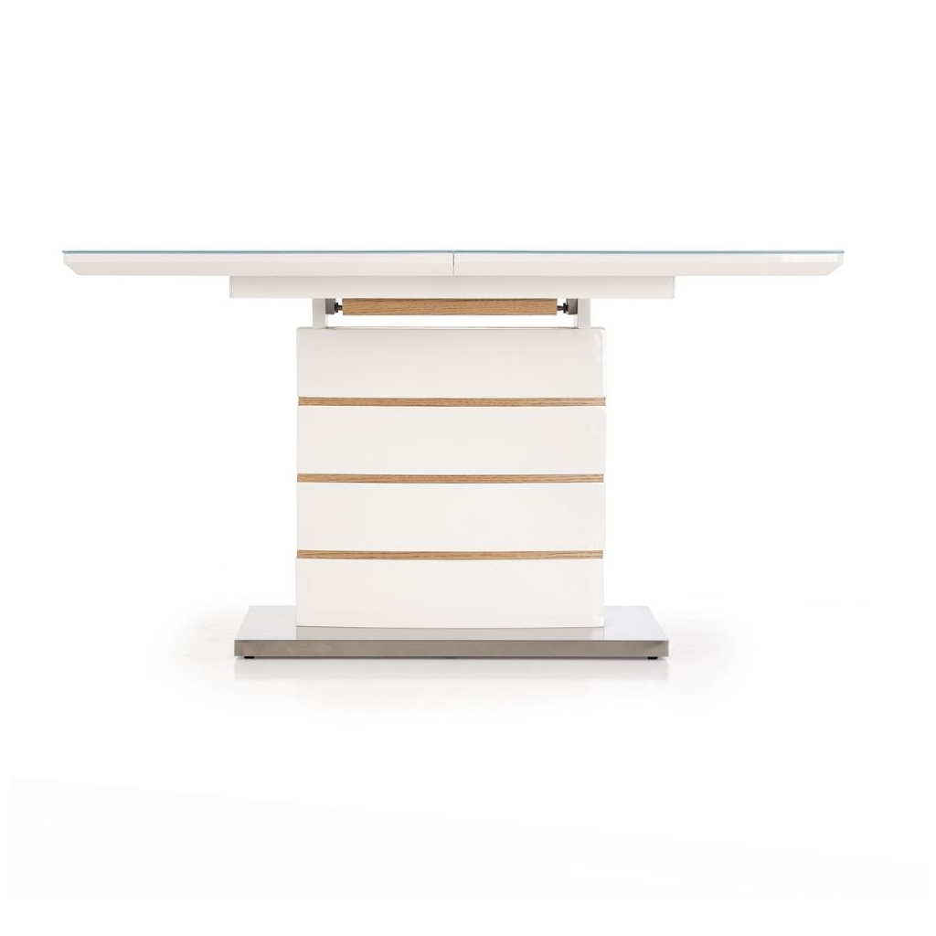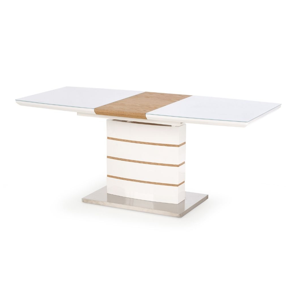 Doska stola je vyrobená z kombinácie skla a lakovanej MDF vrátane dýhy vo farbe biely/zlatý dub. Noha a konštrukcia stola je tiež vyrobená z MDF v kombinácii s nehrdzavejúcou oceľou, tiež v bielej/zlatej farbe duba.