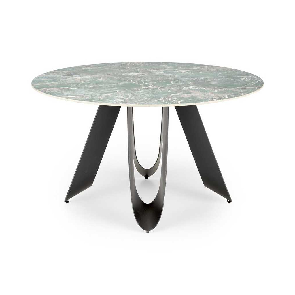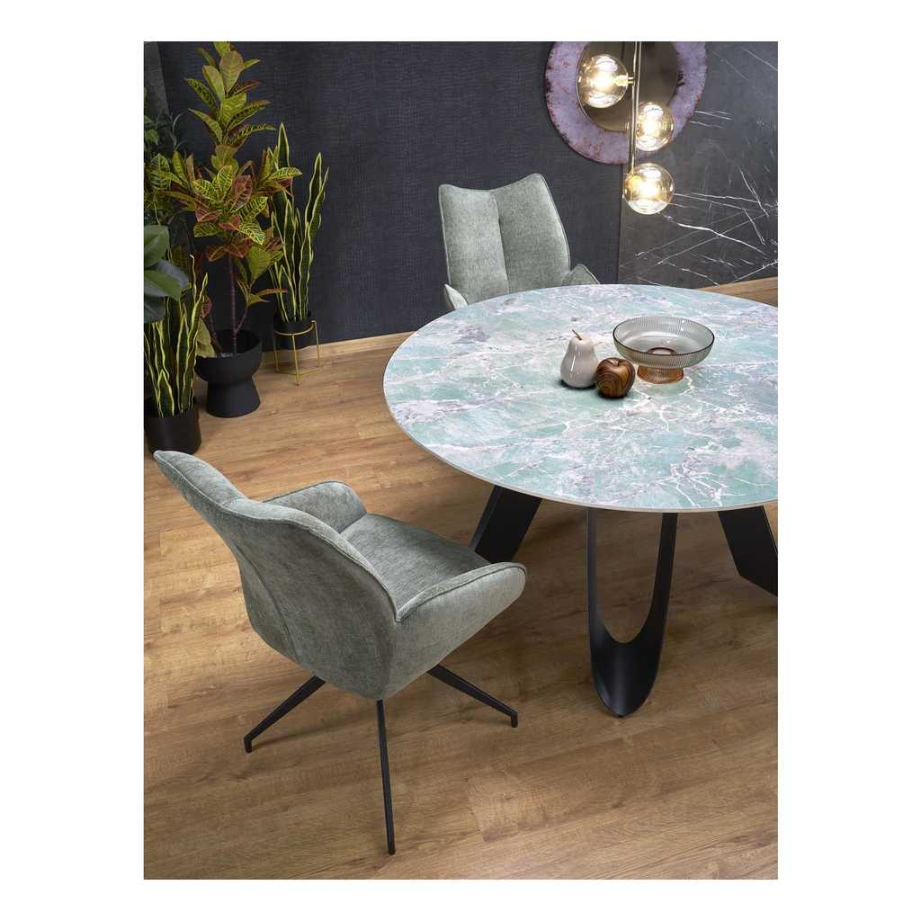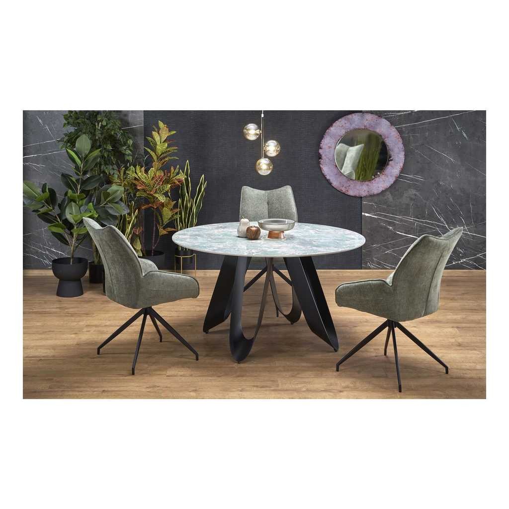 Doska stola s priemerom 135 cm je vyrobená zo sintra, mimoriadne odolného materiálu známeho svojou tvrdosťou aodolnosťou voči poškriabaniu, teplotným zmenám a škvrnám. Povrch stolovej dosky má prírodný vzor pripomínajúci mramor, čo dodáva stolu honosný a elegantný vzhľad.