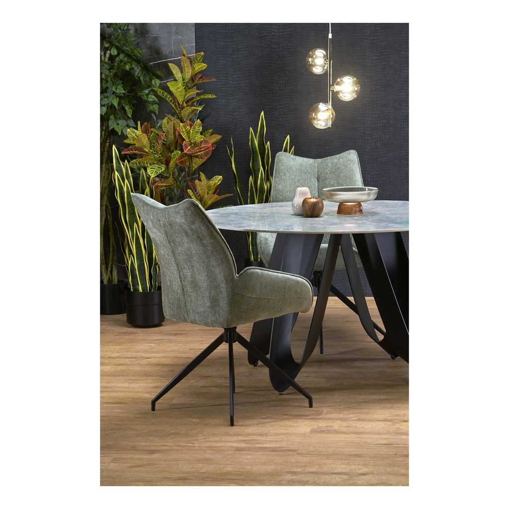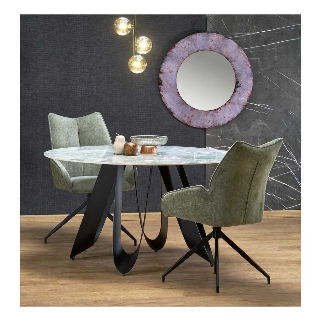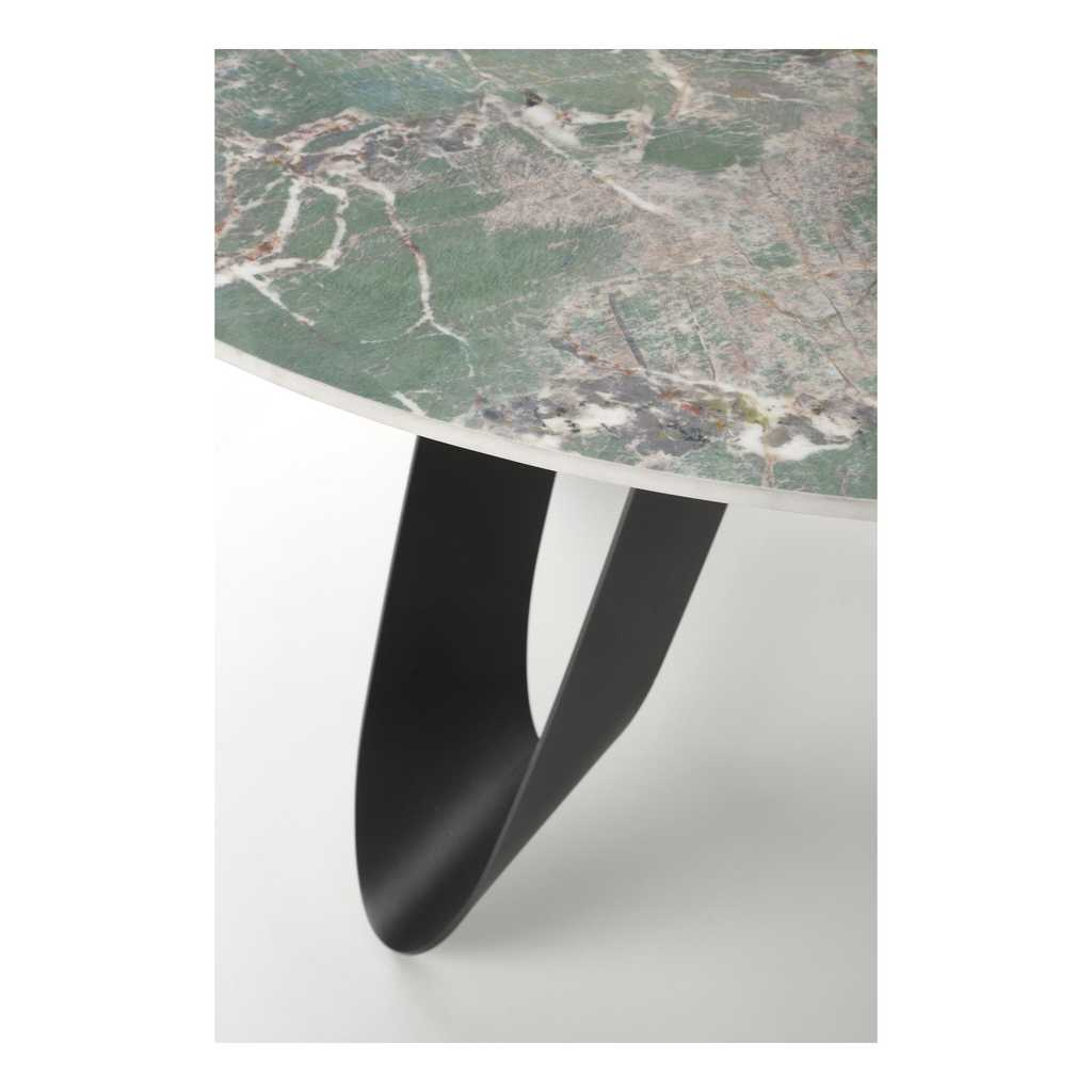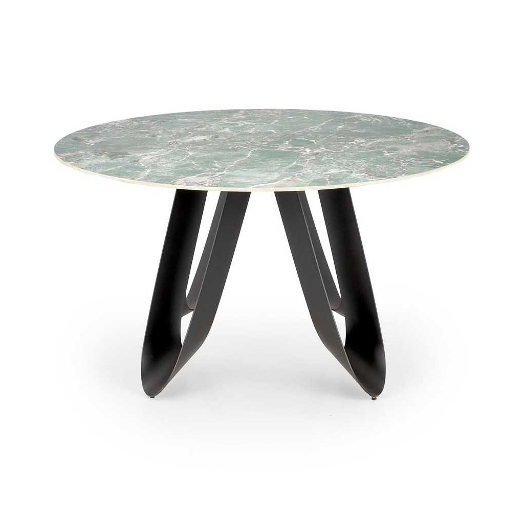 Doska stola s priemerom 135 cm je vyrobená zo sintra, mimoriadne odolného materiálu známeho svojou tvrdosťou aodolnosťou voči poškriabaniu, teplotným zmenám a škvrnám. Povrch stolovej dosky má prírodný vzor pripomínajúci mramor, čo dodáva stolu honosný a elegantný vzhľad.