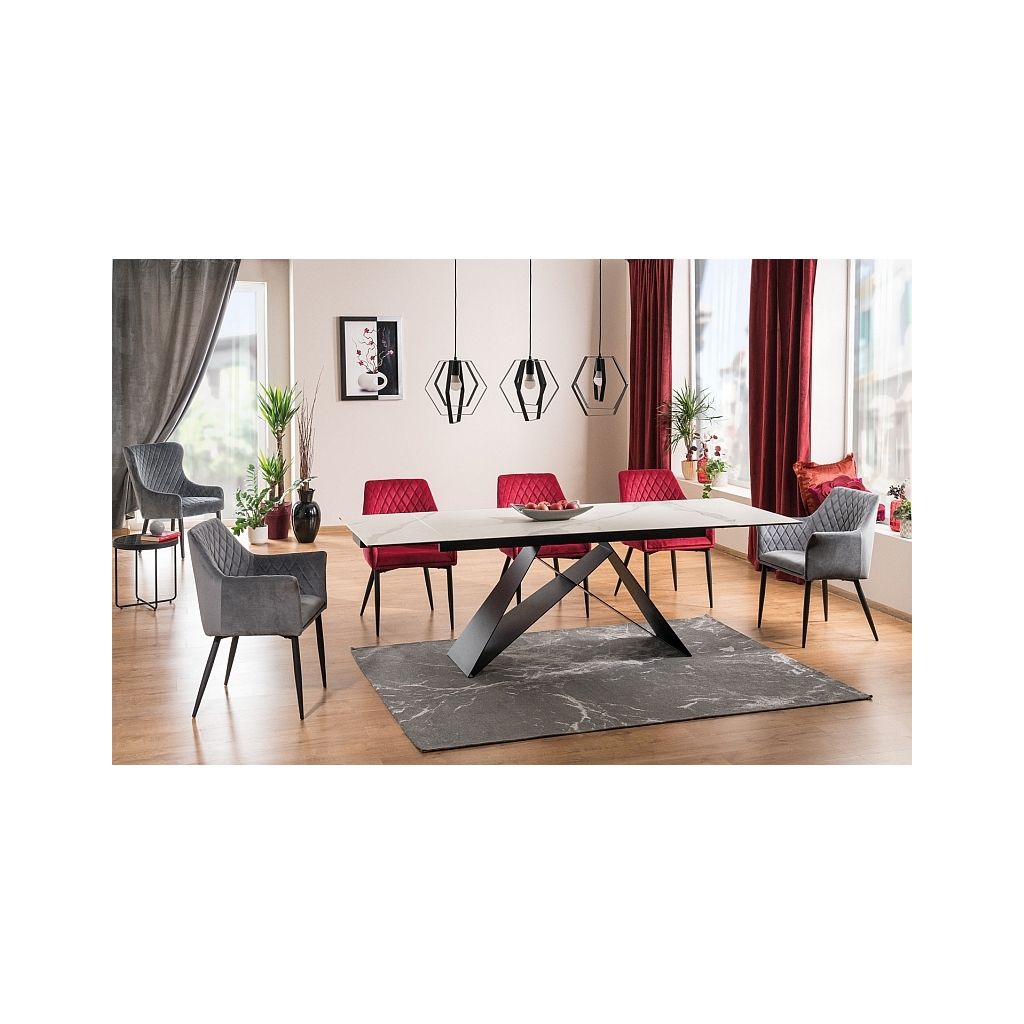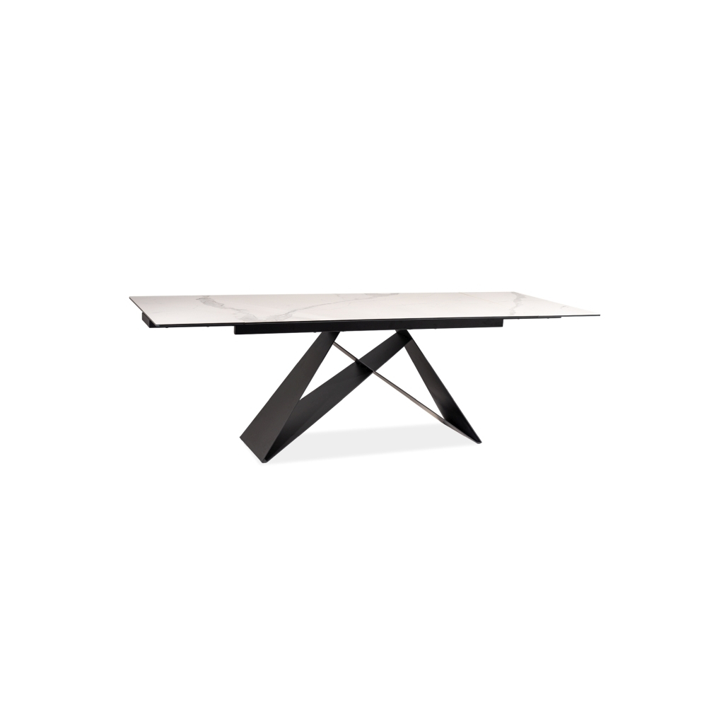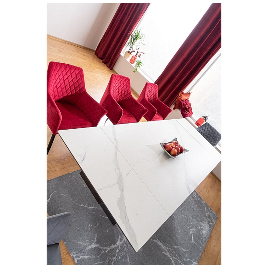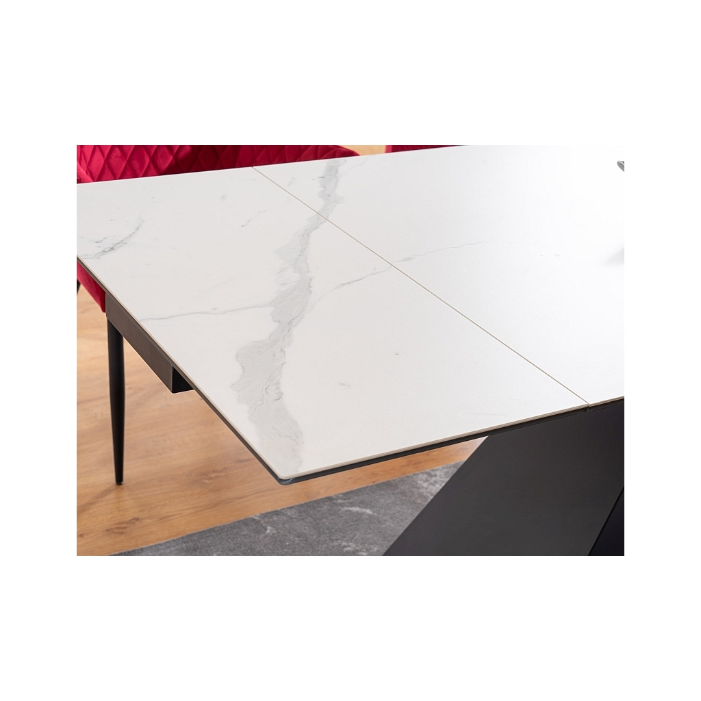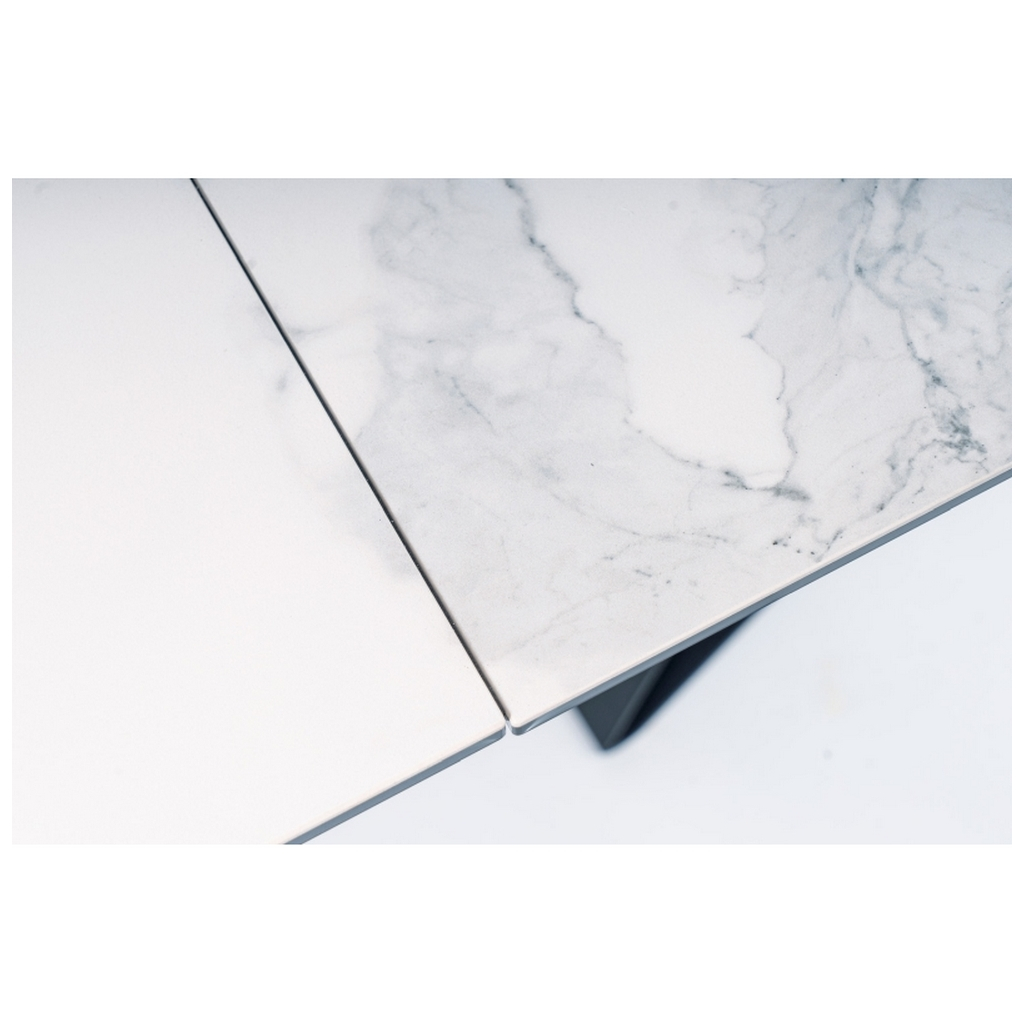Doska stola je vyrobená z tvrdeného skla a talianskej keramiky. Tieto materiály sa spájajú, aby vytvorili mimoriadne odolný, ale aj vizuálne úchvatný povrch. Šarm stola dodáva efekt mramoru Statuario Venato.