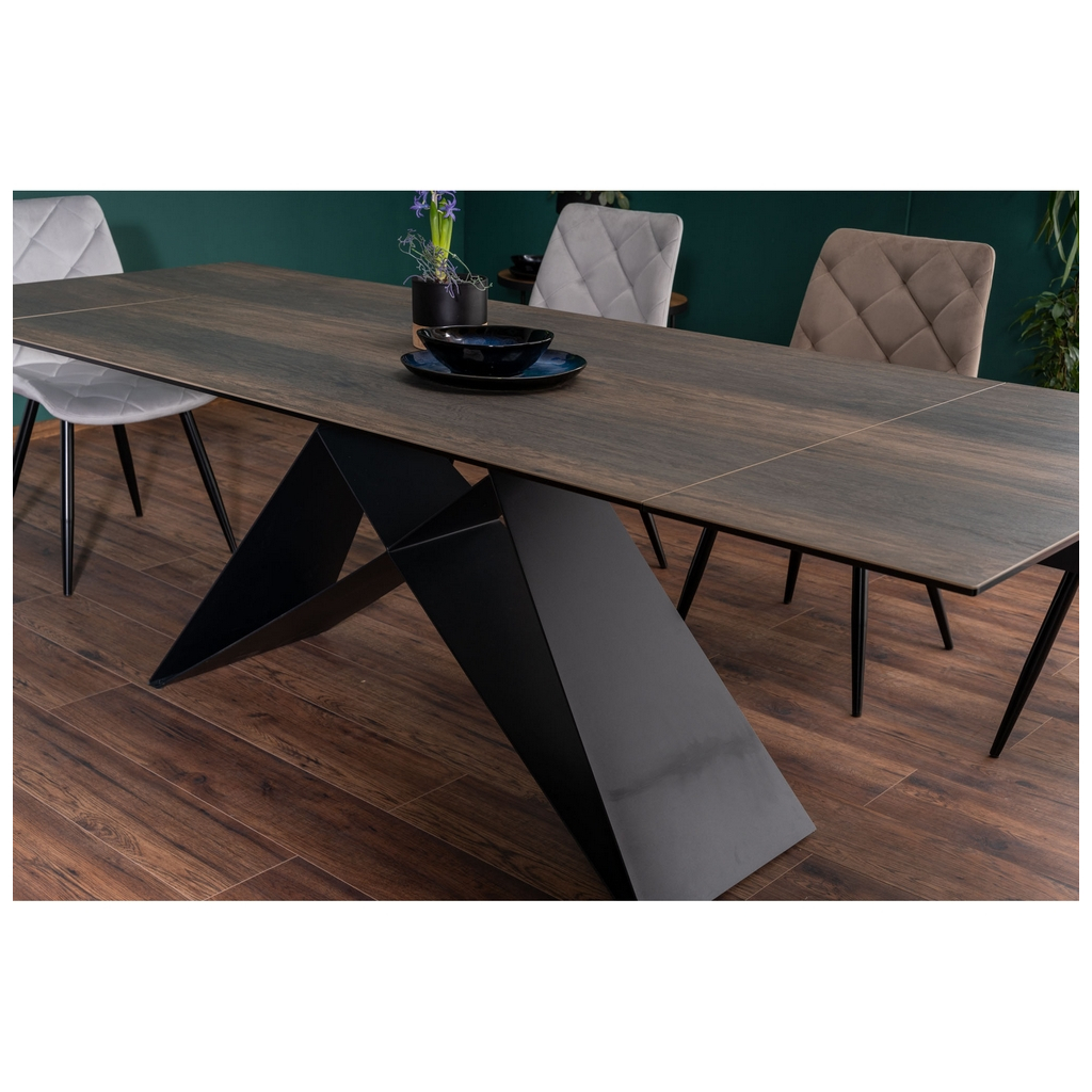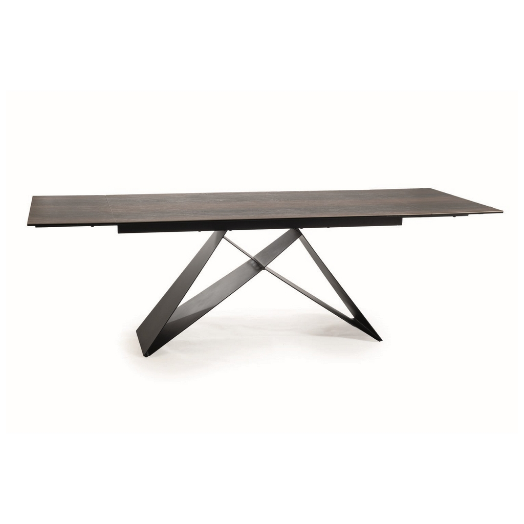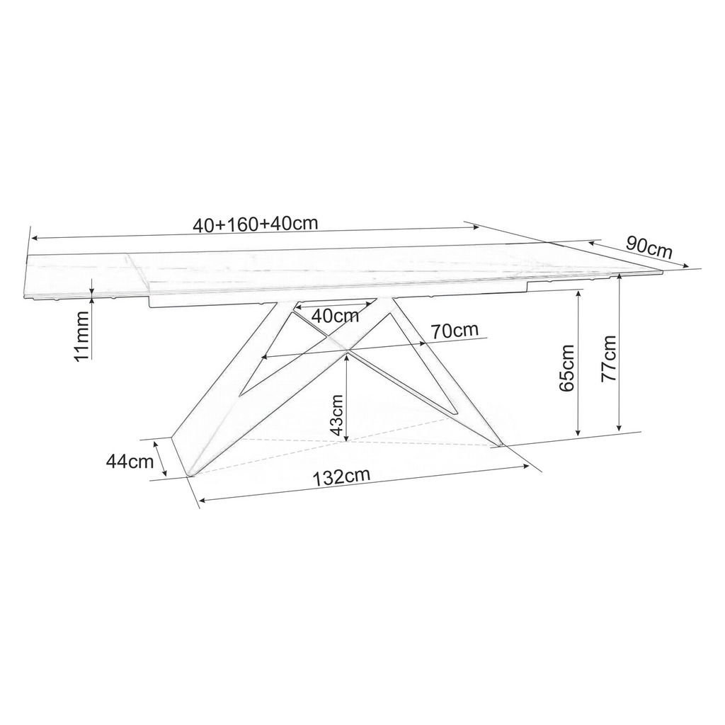Doska stola je zhotovená z tvrdeného skla, čím jedálenský stôl pôsobí mohutne a súčasne elegantne. Nohy zaujímavého a netradičného tvaru sú kovové a zaisťujú stolu žiadúcu stabilitu. Doska stola je v prevedení biely mramor/čierny mat.