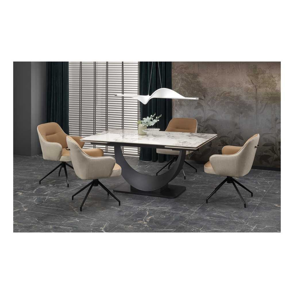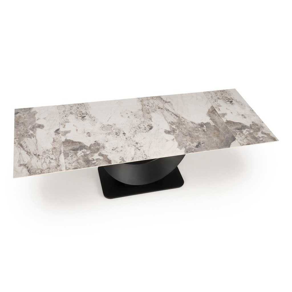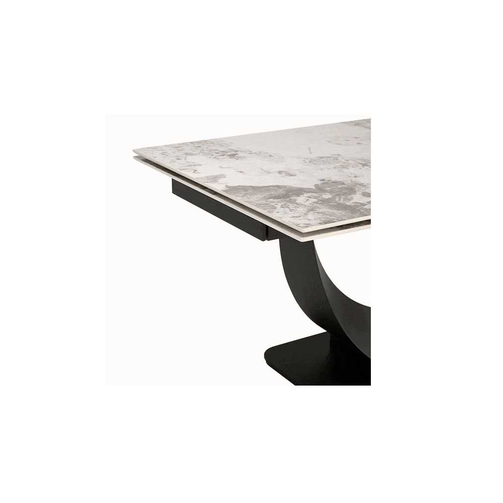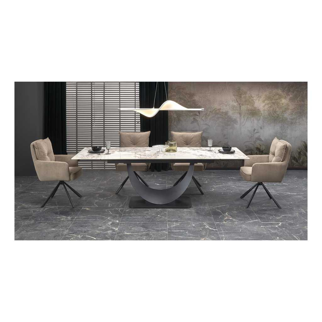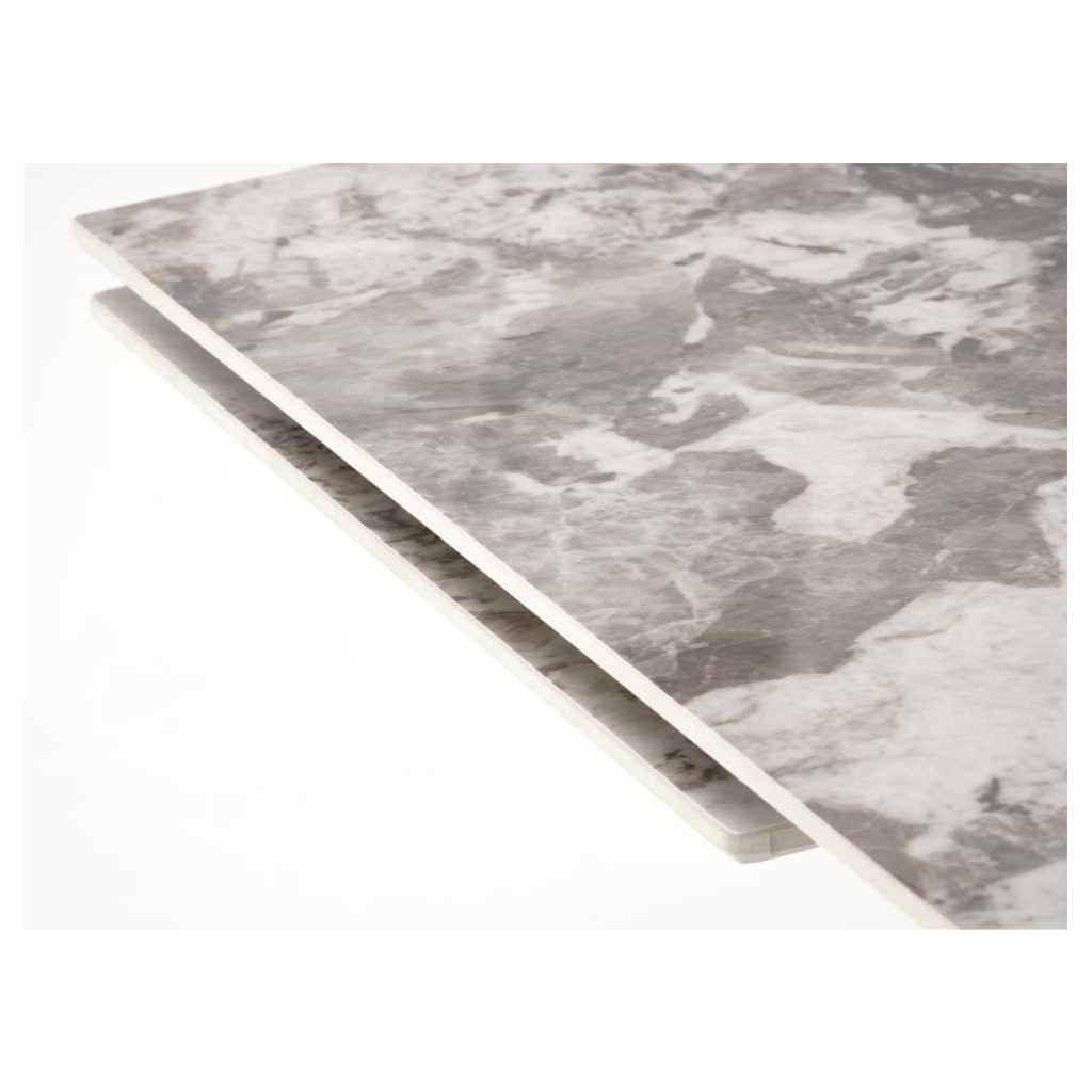 Doska stola je vyrobená zo slinku s mramorovým efektom. Táto kombinácia vytvára mimoriadne odolný a zároveň vizuálne ohromujúci povrch vhodný na každodenné používanie aj na špeciálne príležitosti.