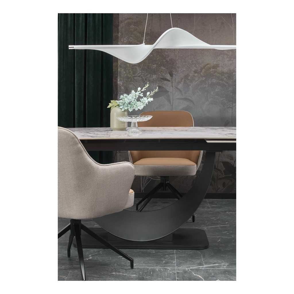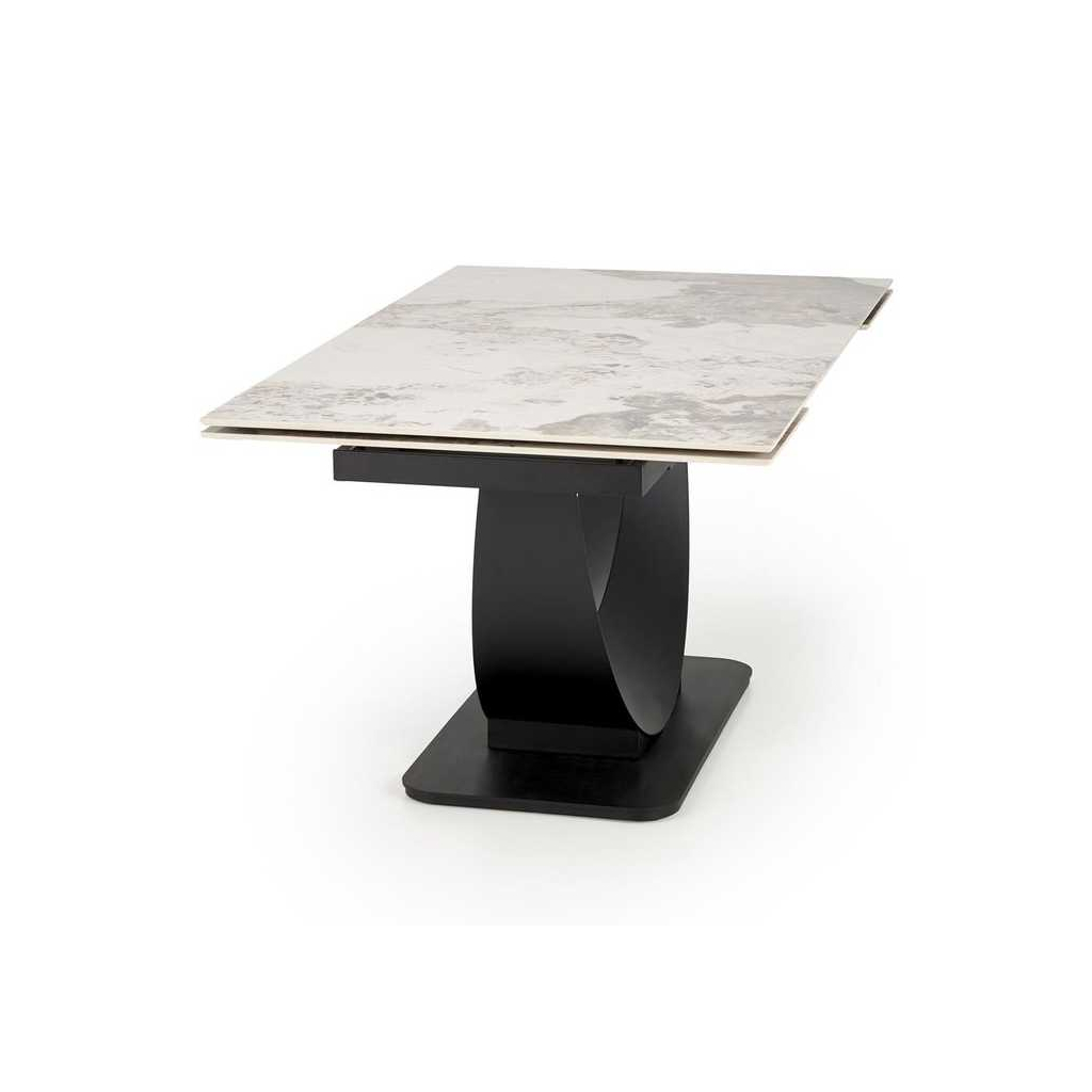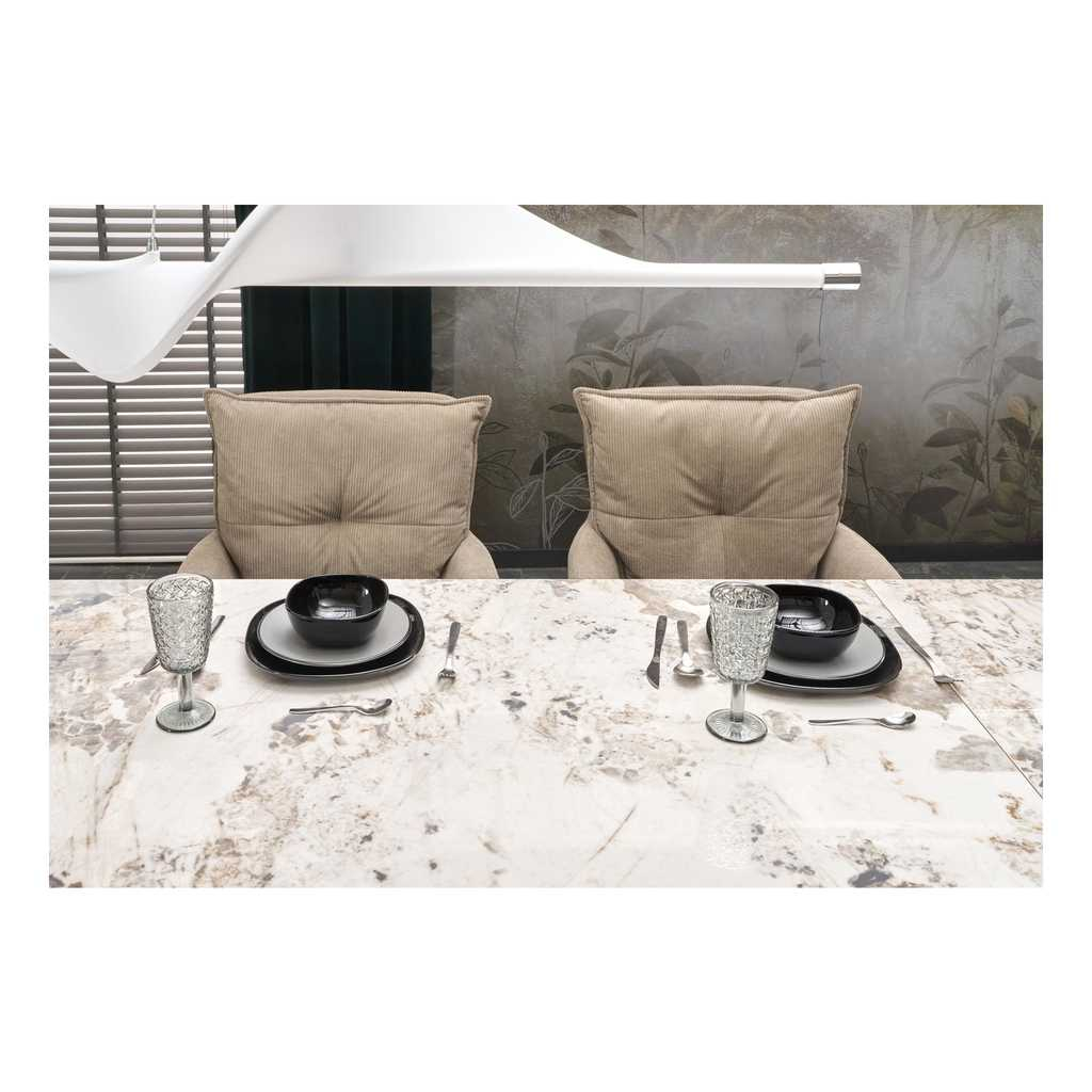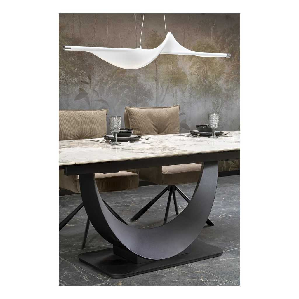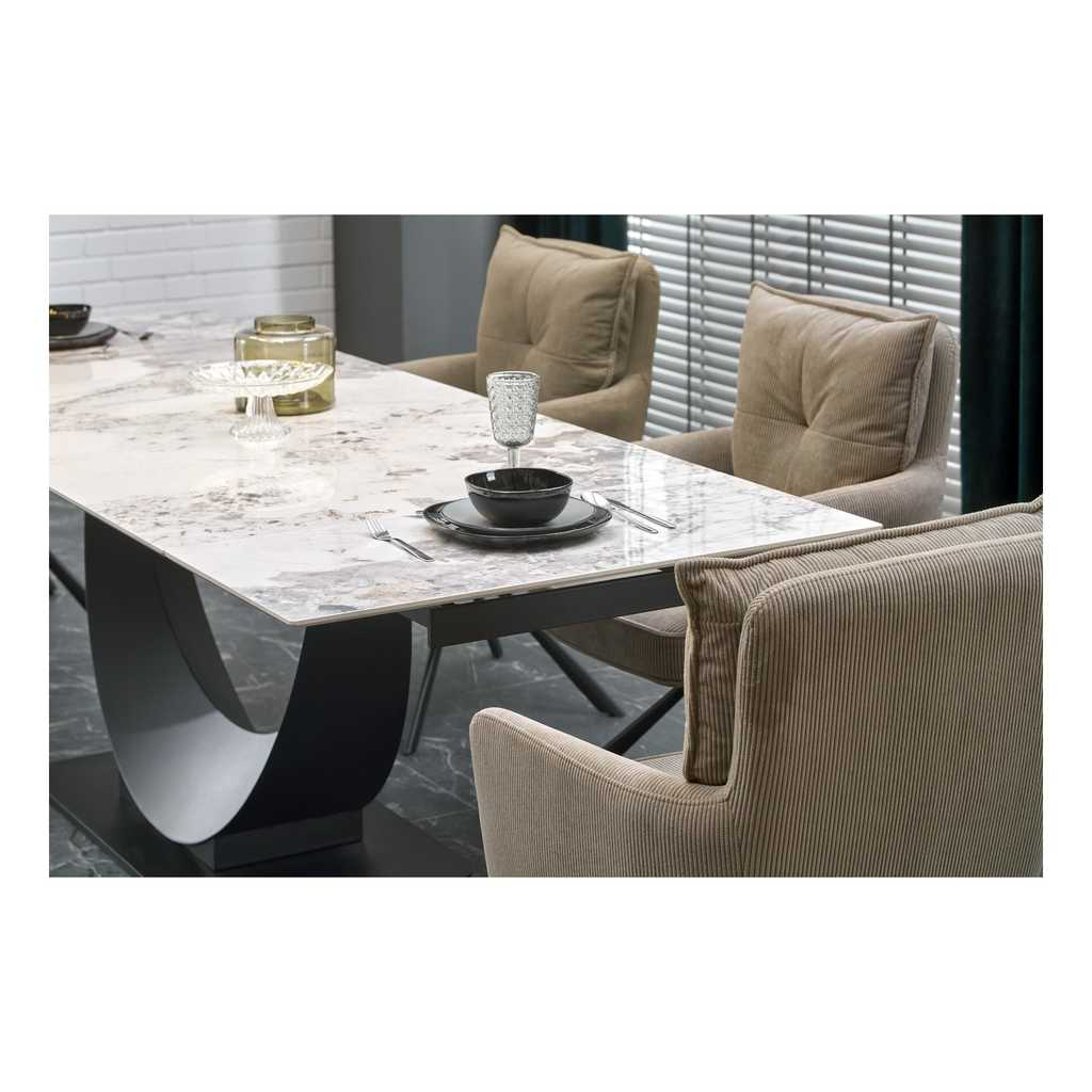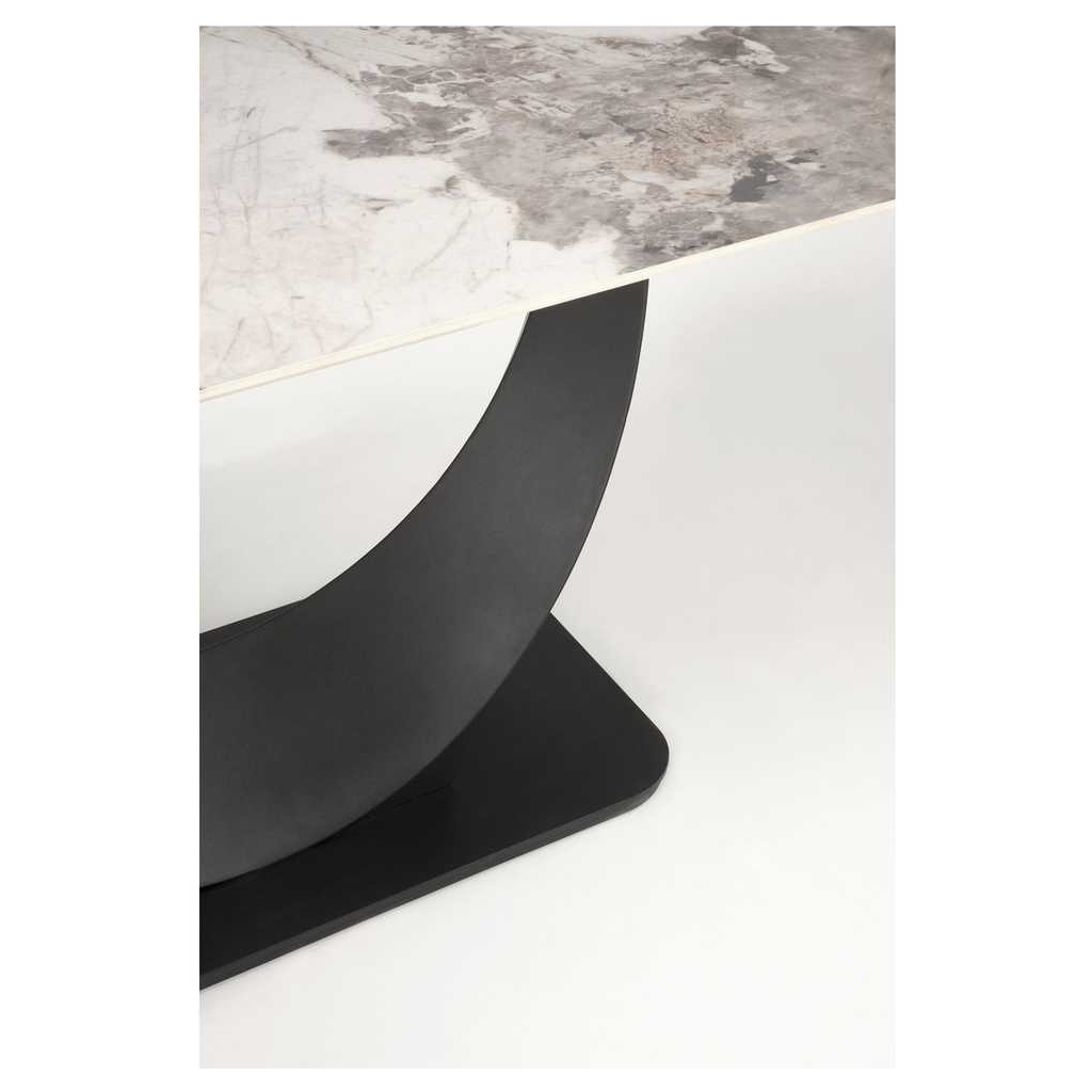 Doska stola je vyrobená zo slinku s mramorovým efektom. Táto kombinácia vytvára mimoriadne odolný a zároveň vizuálne ohromujúci povrch vhodný na každodenné používanie aj na špeciálne príležitosti.