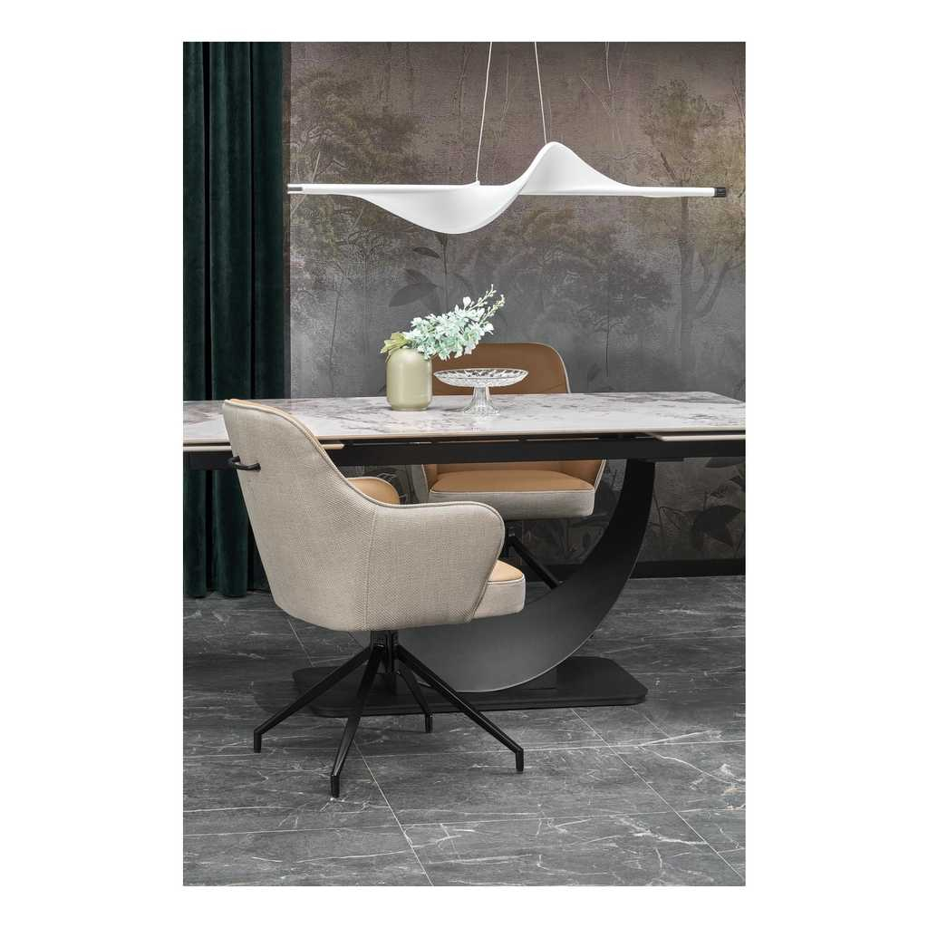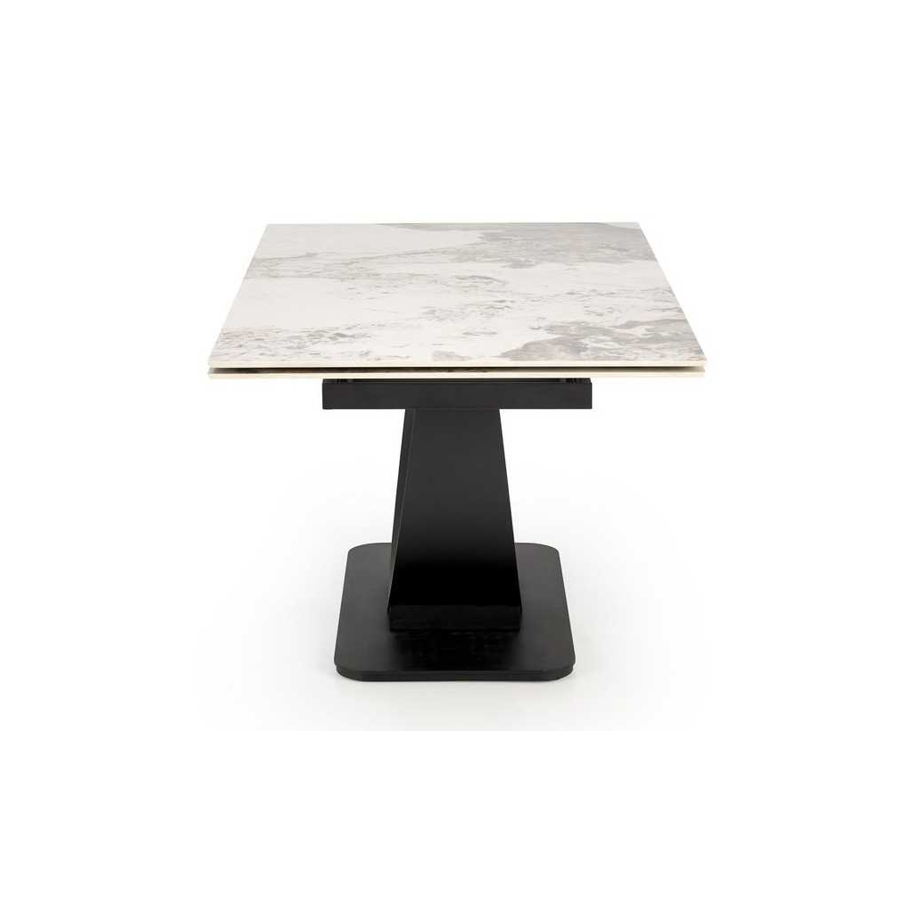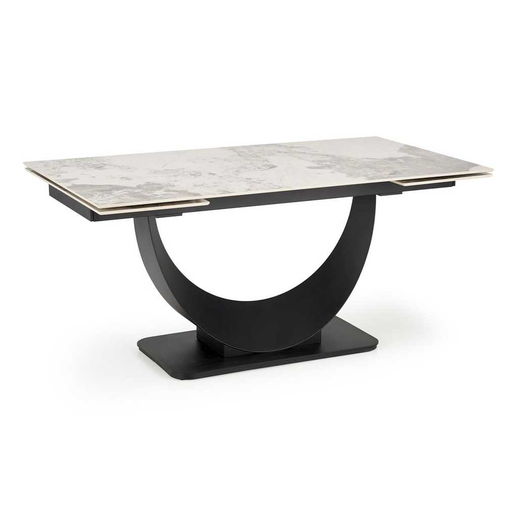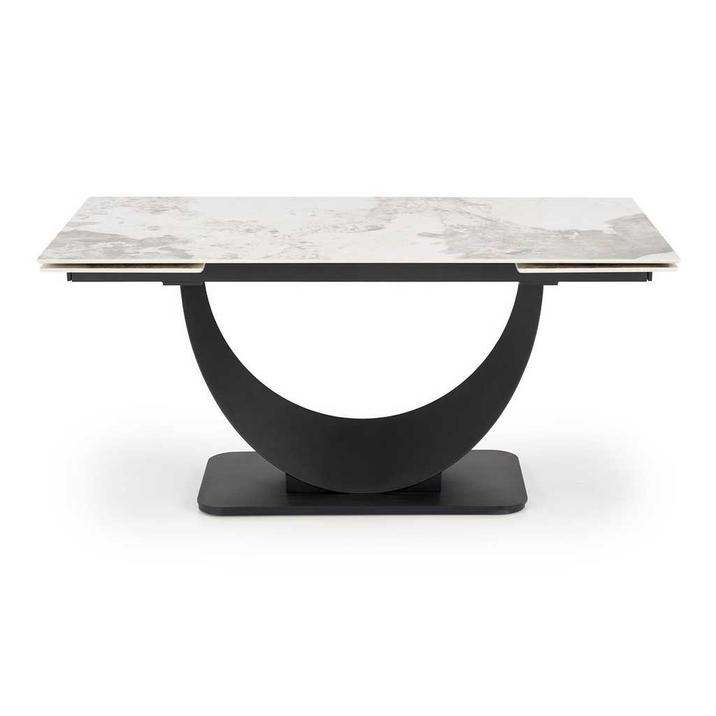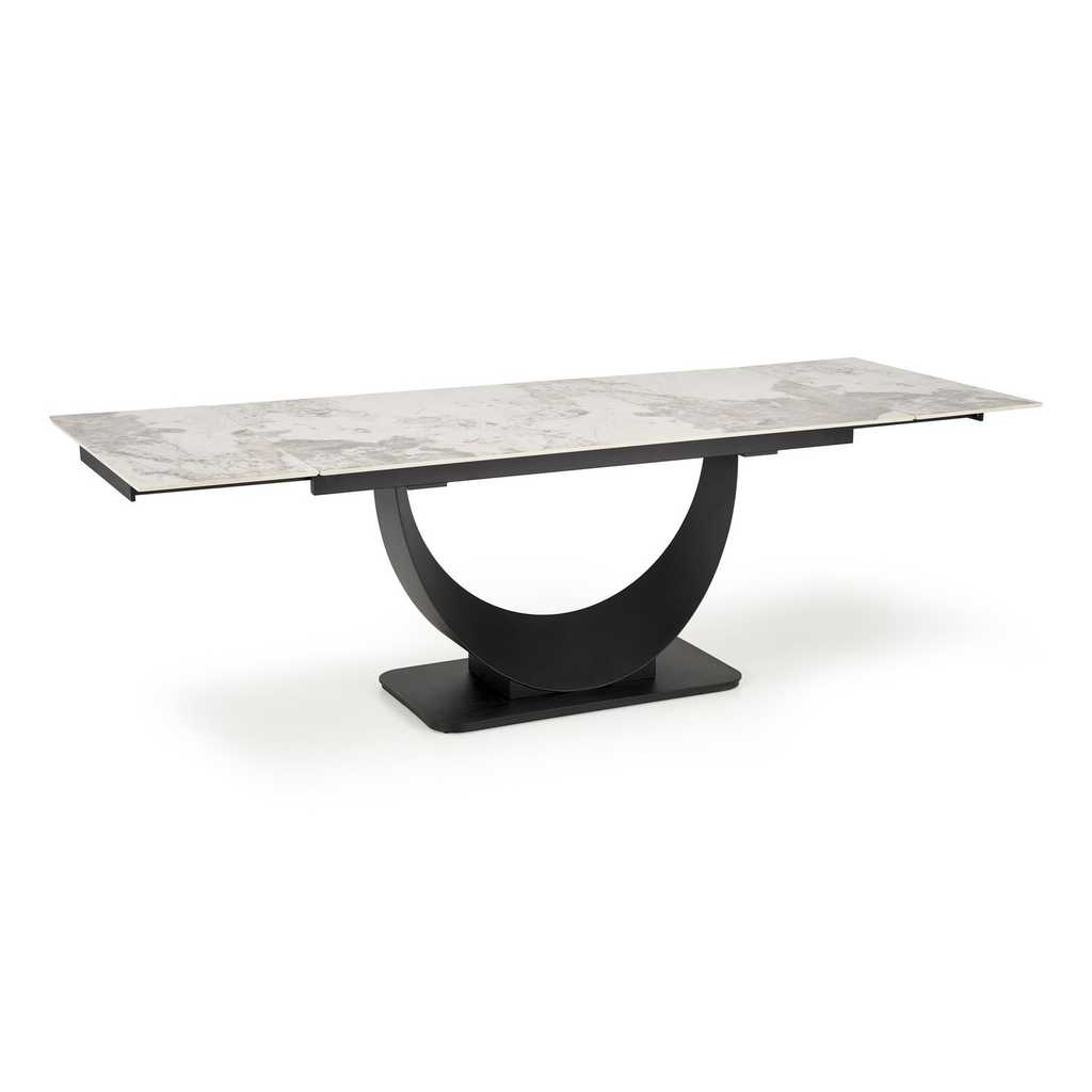 Doska stola je vyrobená zo slinku s mramorovým efektom. Táto kombinácia vytvára mimoriadne odolný a zároveň vizuálne ohromujúci povrch vhodný na každodenné používanie aj na špeciálne príležitosti.