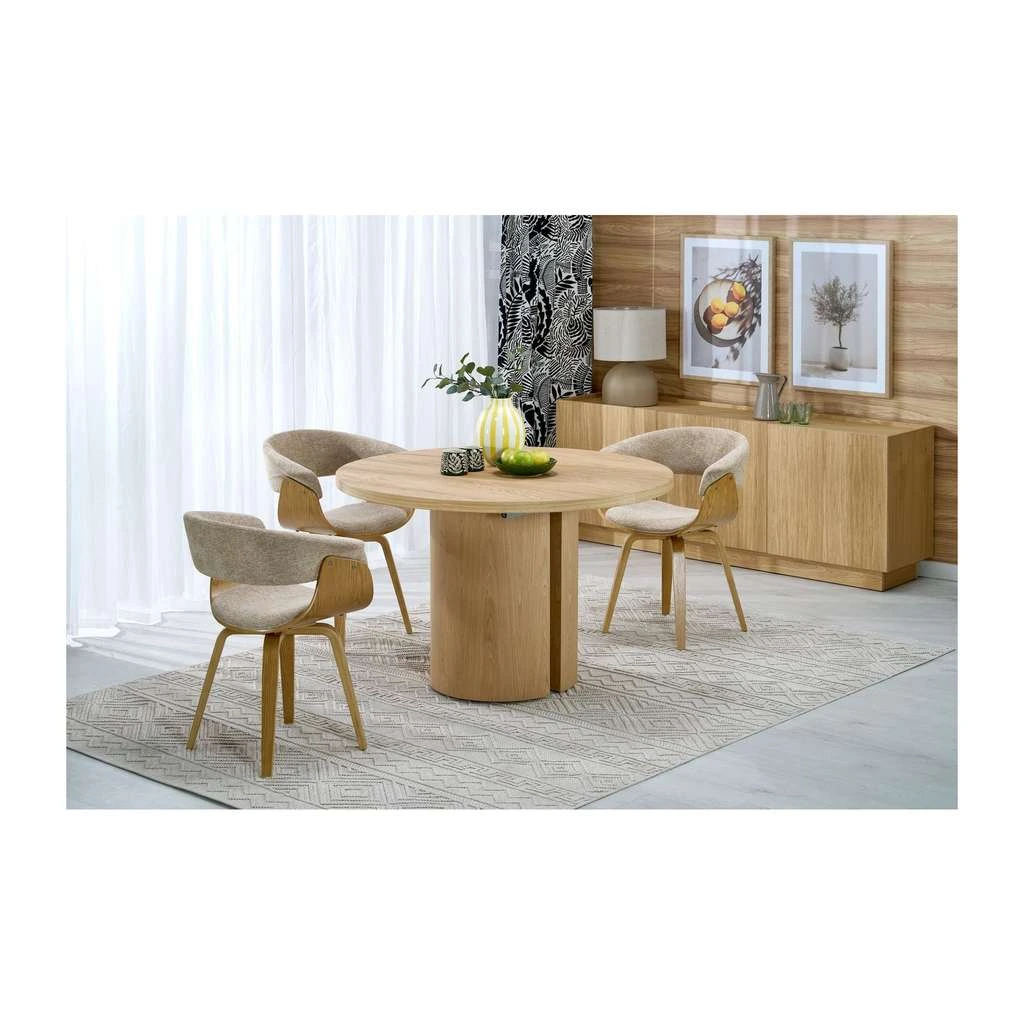 Stôl má pevné a stabilné drevené zakončenie s praktickým mechanizmom rozloženia, ktorý mení tvar dosky z plného kruhu na ovál, čím zabezpečuje viac priestoru pre hostí bez toho, aby sa obetoval estetický vzhľad.