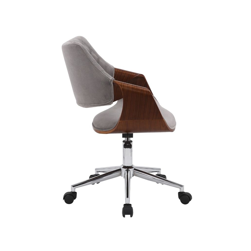 Táto vzhľadovo originálna a netradičná stolička oživí vašu kanceláriu. Stolička je vyrobená z kombinácie preglejky a látky vo farebnej kombinácii šedej a orechu.