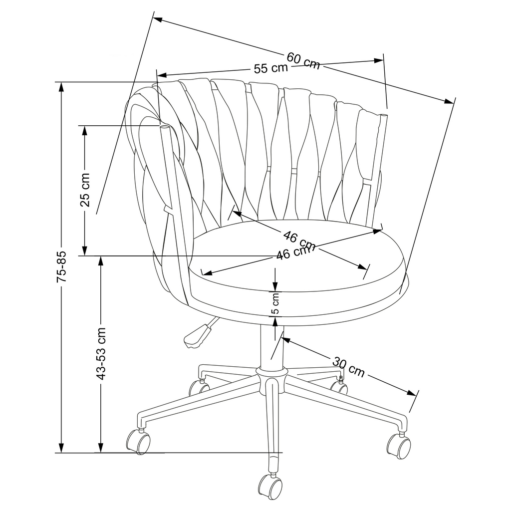 Fang je svojou konštrukciou pomyselne na pol cesty medzi bežným a kancelárskym kreslom – elegantné sedadlo je bohato polstrované a potiahnuté látkou po celom povrchu, namiesto pevnej podnože ho ale nesie kríž s kolieskami a výškovo nastaviteľným piestom. Toto kreslo odporúčame na kratšie sedenie napríklad v pracovni alebo rokovacej miestnosti. Poďme sa naň pozrieť zblízka!