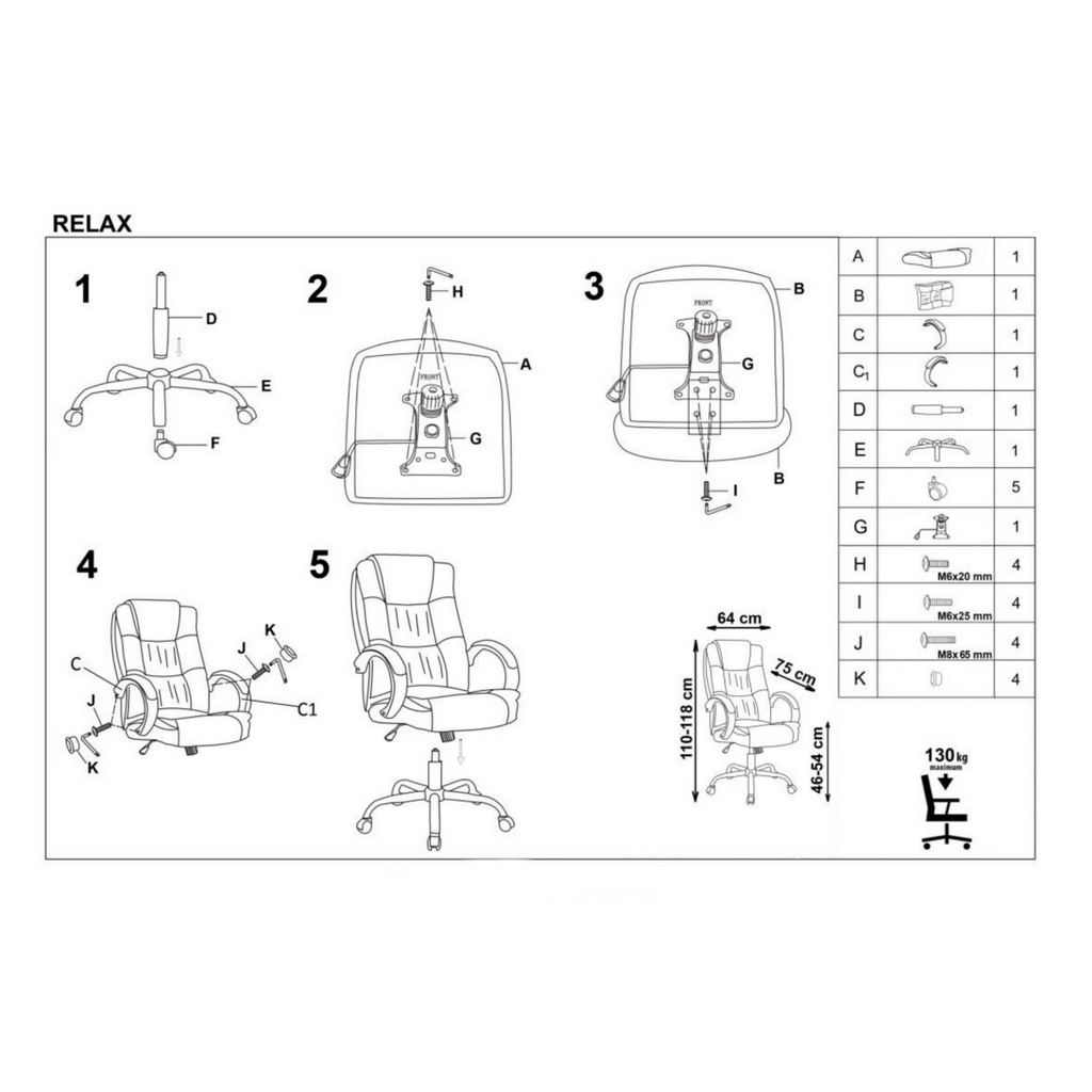 Základom celého kresla Relax je kovový kríž s pochromovaným povrchom, plynový piest s nosnosťou 130 kg a pogumované kolieska, ktoré sú vhodné ako na mäkké podlahy, tak na tie tvrdšie.