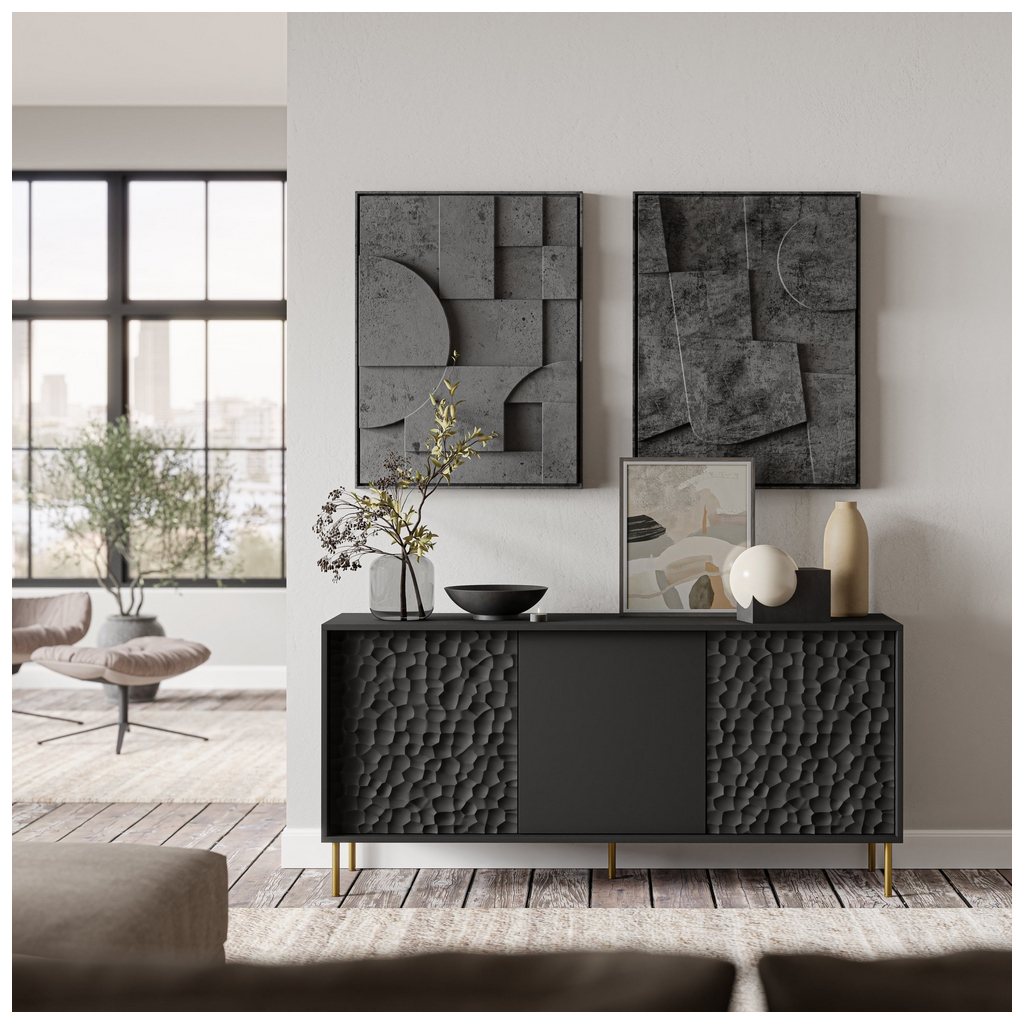 Niektoré plochy ozvláštňuje nepravidelná plastická štruktúra, ktorá vkusne dopĺňa rovné plochy a dodáva nábytkovému radu na charaktere.