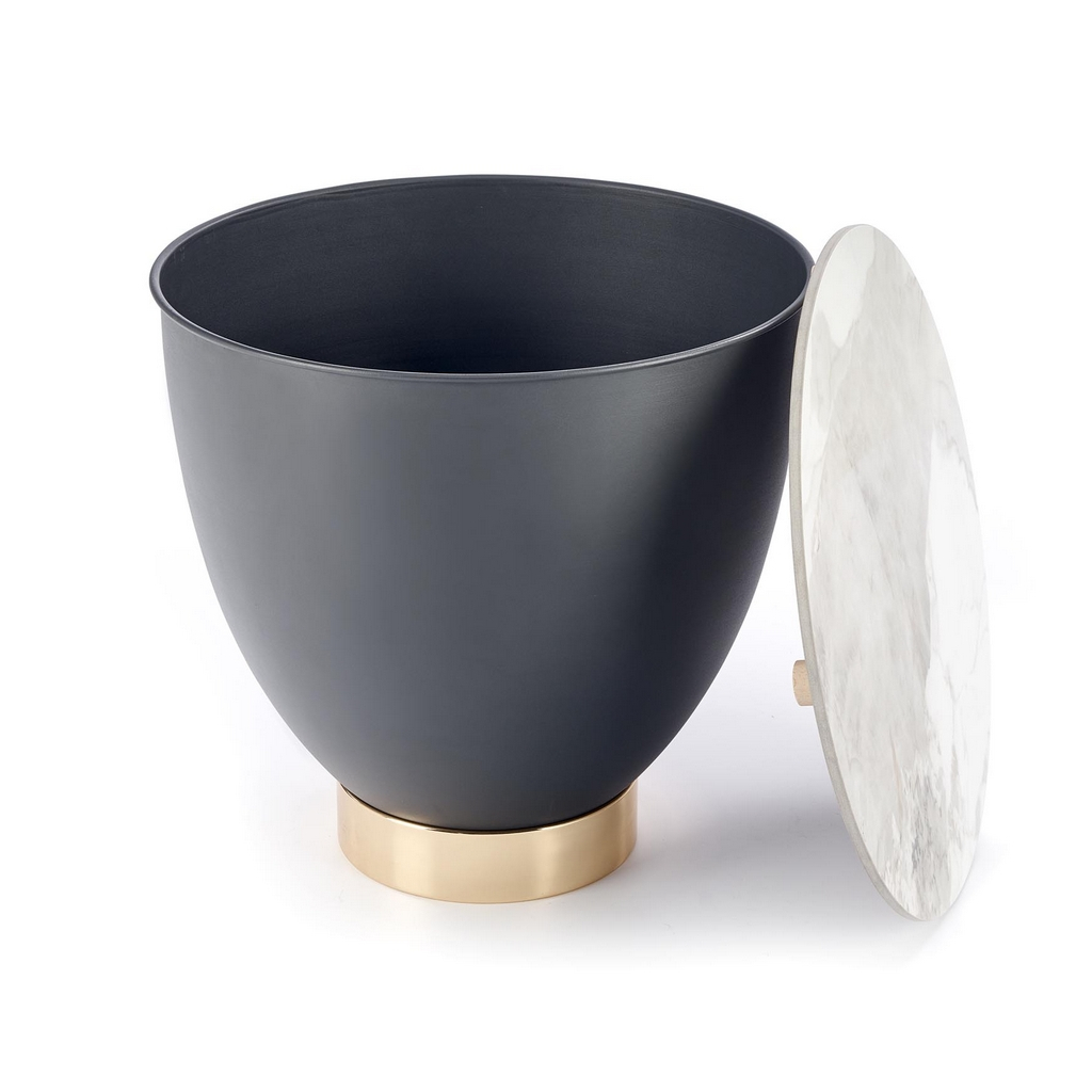 Podnož má potom podobu dutej nádoby z práškovanej ocele. Podstava, na ktorej stojí, má zlatistú farbu, ktorá sa so zvyškom stolíka vkusne dopĺňa.