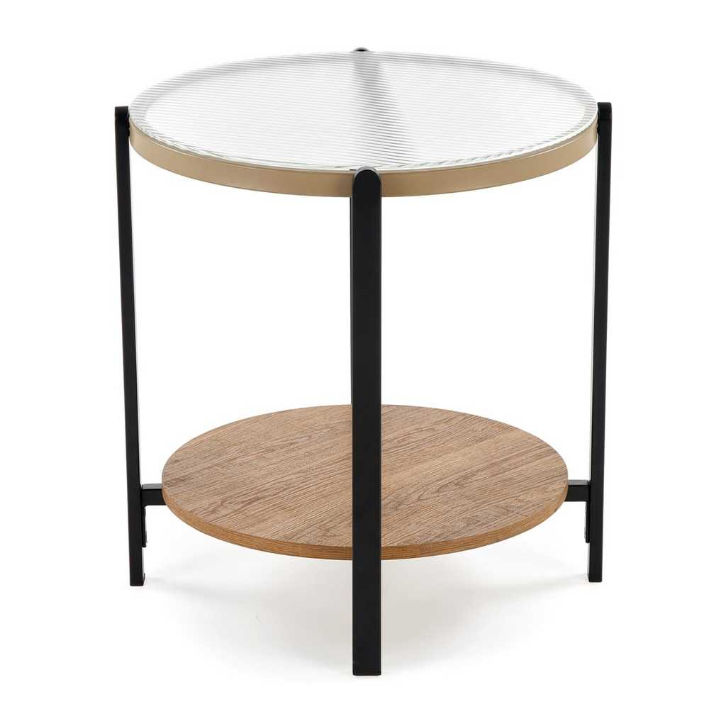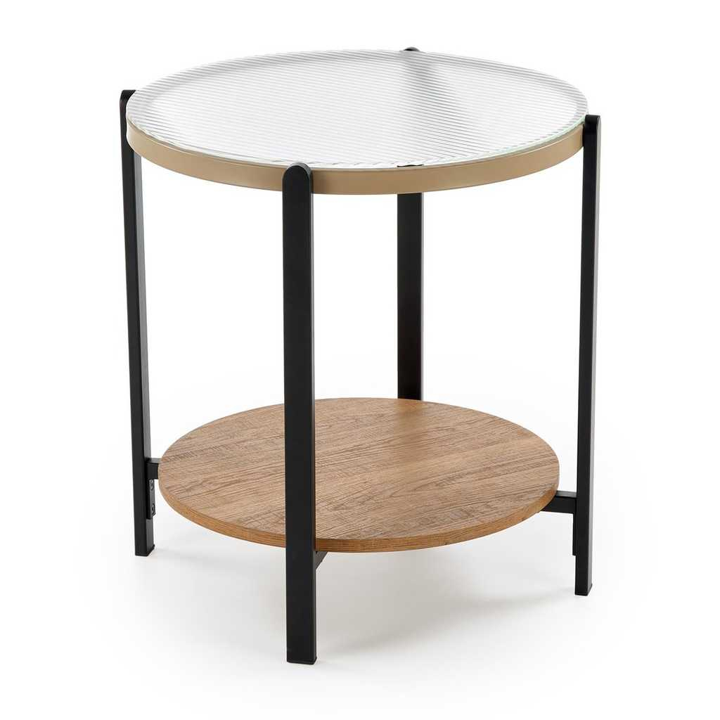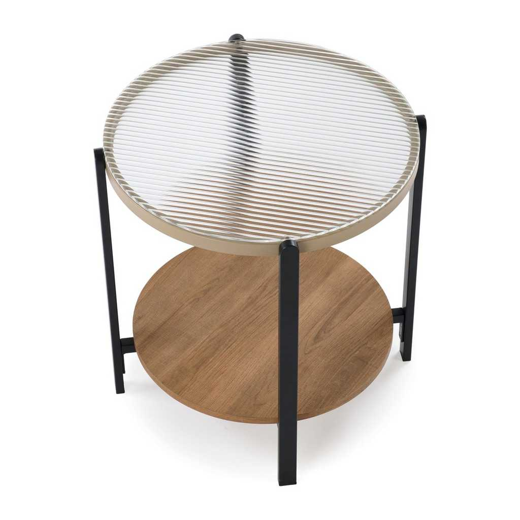 Stolík má aj dolnú dosku z drevodekoru, ktorá poskytuje dodatočný priestor pre uskladnenie alebo vystavenie predmetov. Vďaka tvaru kruhu a stabilnej kovovej podnoži pôsobí elegantne a minimalisticky, čo doplní akýkoľvek interiér.
