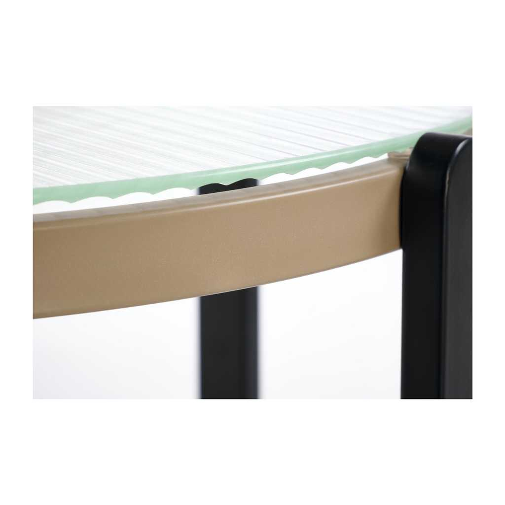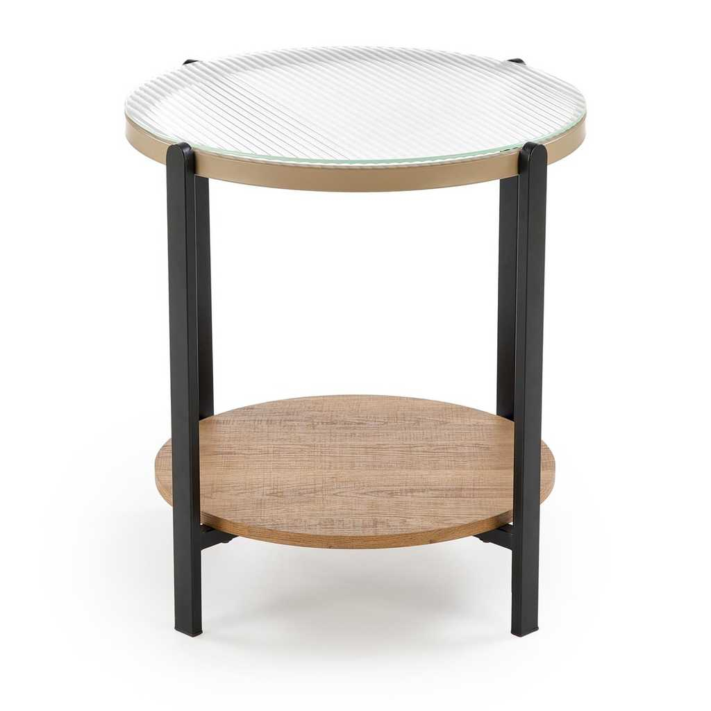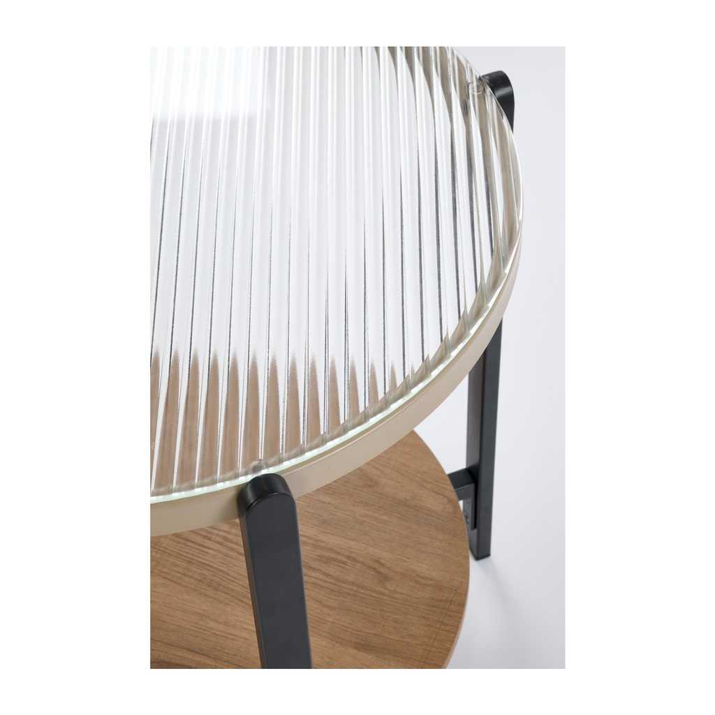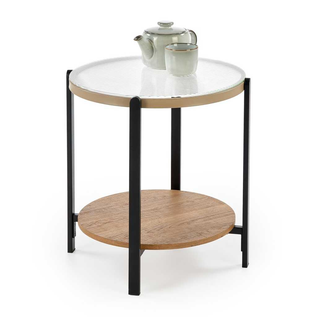 Stolík má aj dolnú dosku z drevodekoru, ktorá poskytuje dodatočný priestor pre uskladnenie alebo vystavenie predmetov. Vďaka tvaru kruhu a stabilnej kovovej podnoži pôsobí elegantne a minimalisticky, čo doplní akýkoľvek interiér.