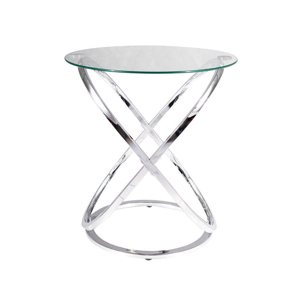 Stolík má guľatý tvar a je vyrobený v kombinácií pevnej kovovej konštrukcie a hornej dosky z tvrdeného skla.