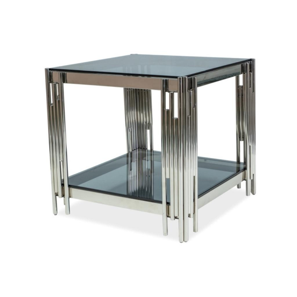 Vrchná doska stola je vyrobená z tvrdeného skla s dymovou úpravou. Skvelo tak ladí s pochrómovanou kovovou podnožou.