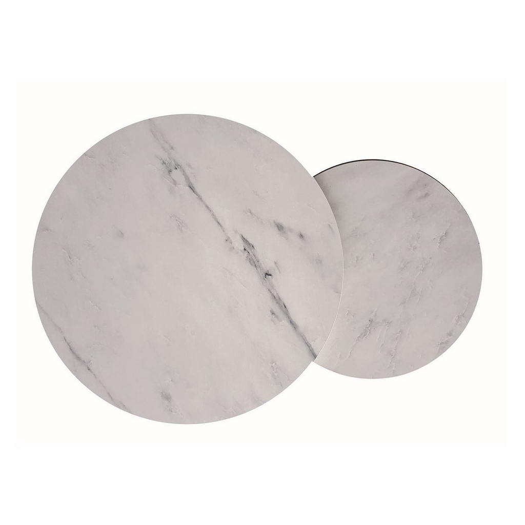 Oba stolíky majú kruhovú dosku z laminovanej drevotriesky, ktorú nesie matne zlatá kovová podnož. Vybrať si môžete z niekoľkých farebných prevedení.