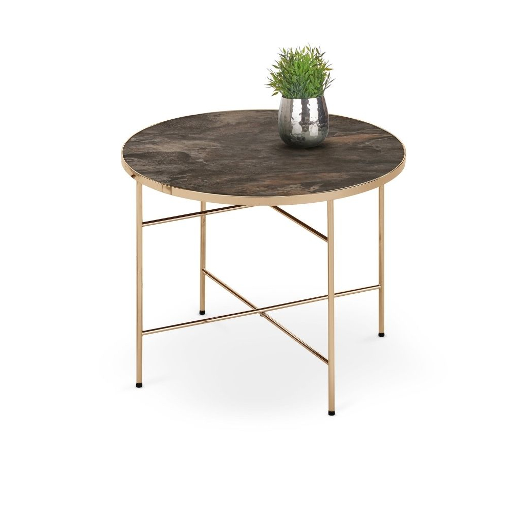 Konferenčný stolík Isabelle je okrúhleho tvaru so zaujímavo riešeným postavením na oceľových nôžkach v zlatej farbe. Doska stolíka je vyrobená z tvrdeného skla v dekore mramor, ktorý je stálicou na poli dizajnu.