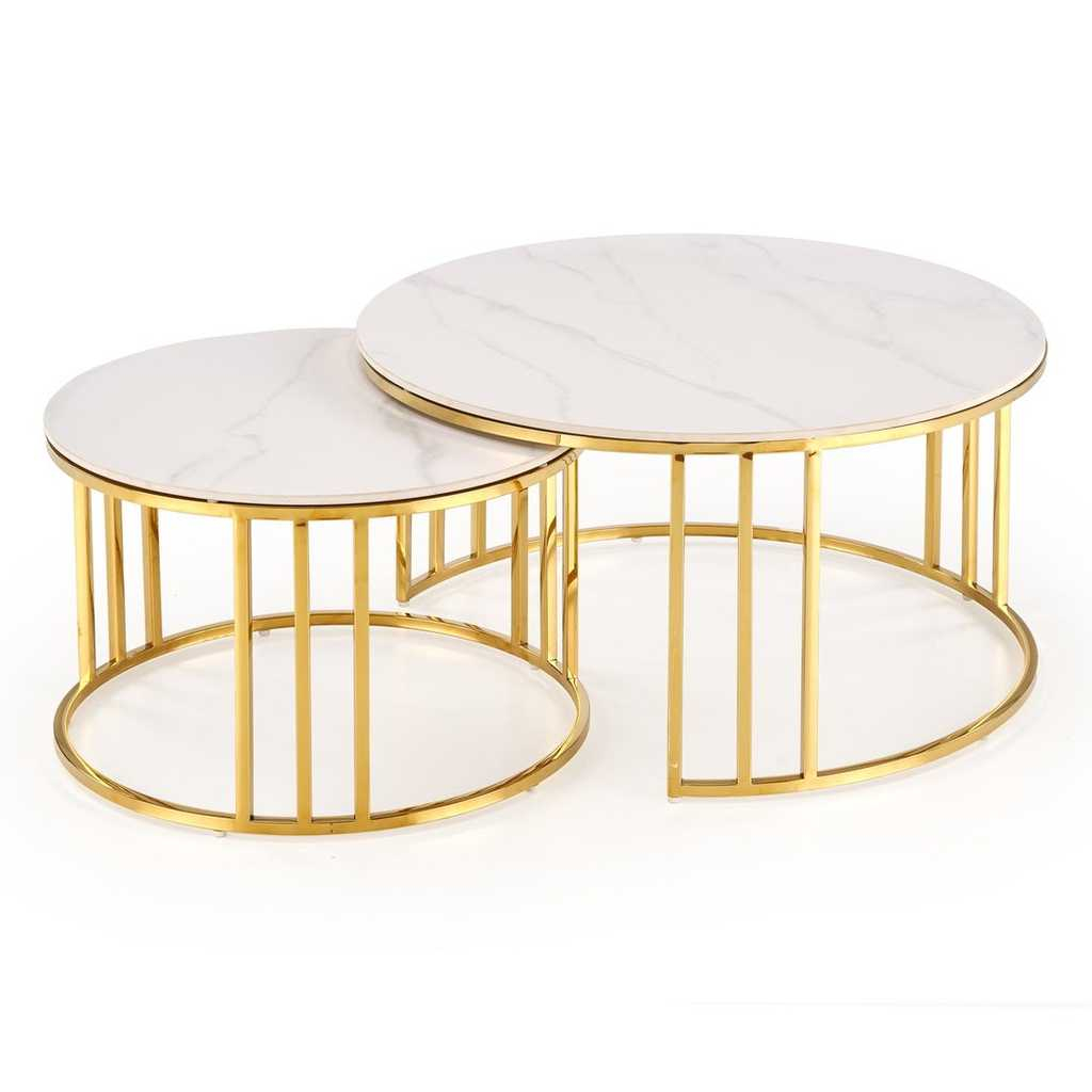 Oba stoly sa môžu pochváliť kruhovou doskou z umelého kameňa (sintra) s kovovou výstuhou po obvode. Zlaté podstavce sú tiež vyrobené z nehrdzavejúcej ocele.