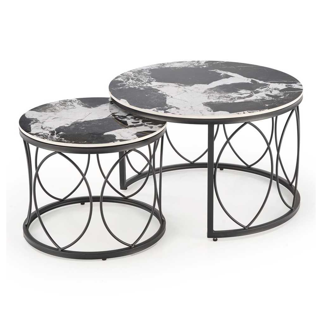 Dizajnovo k sebe stoly dokonale ladia - oba majú kruhovú dosku z umelého kameňa a čiernu kovovú podnož zdobenú oválnymi motívmi.