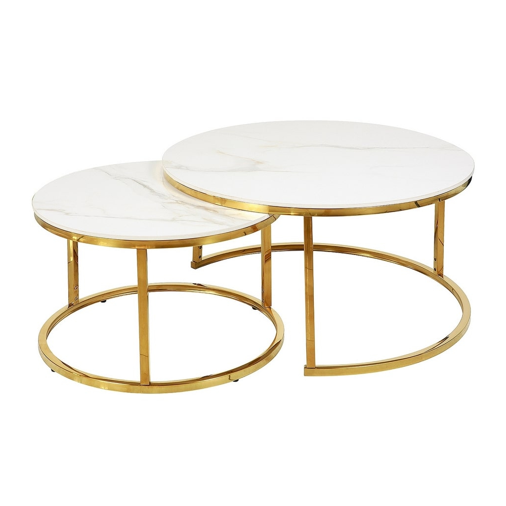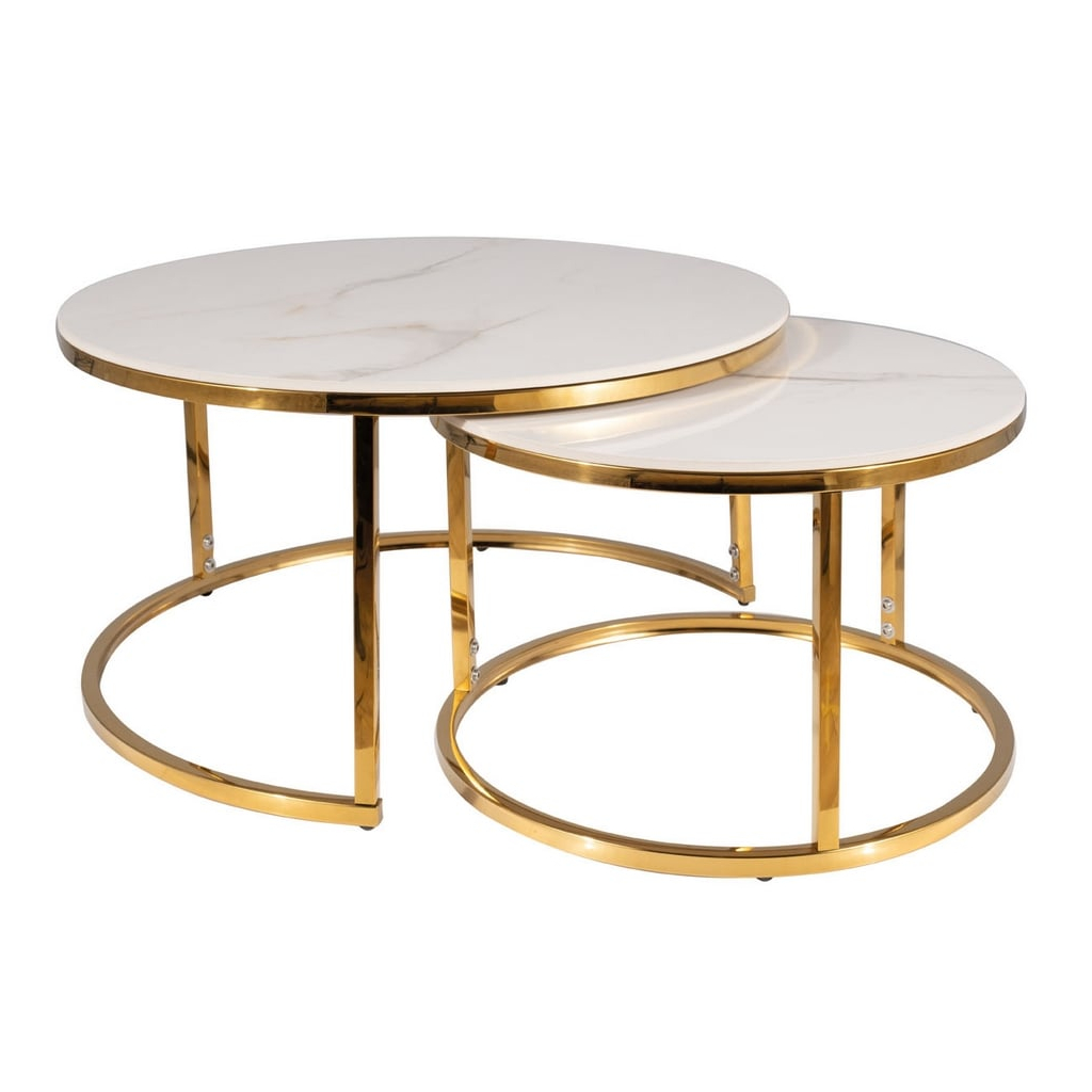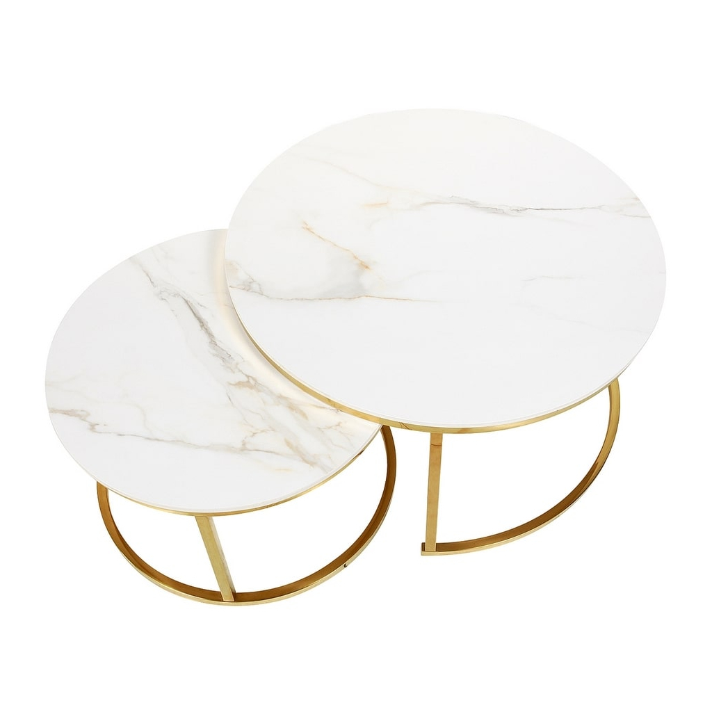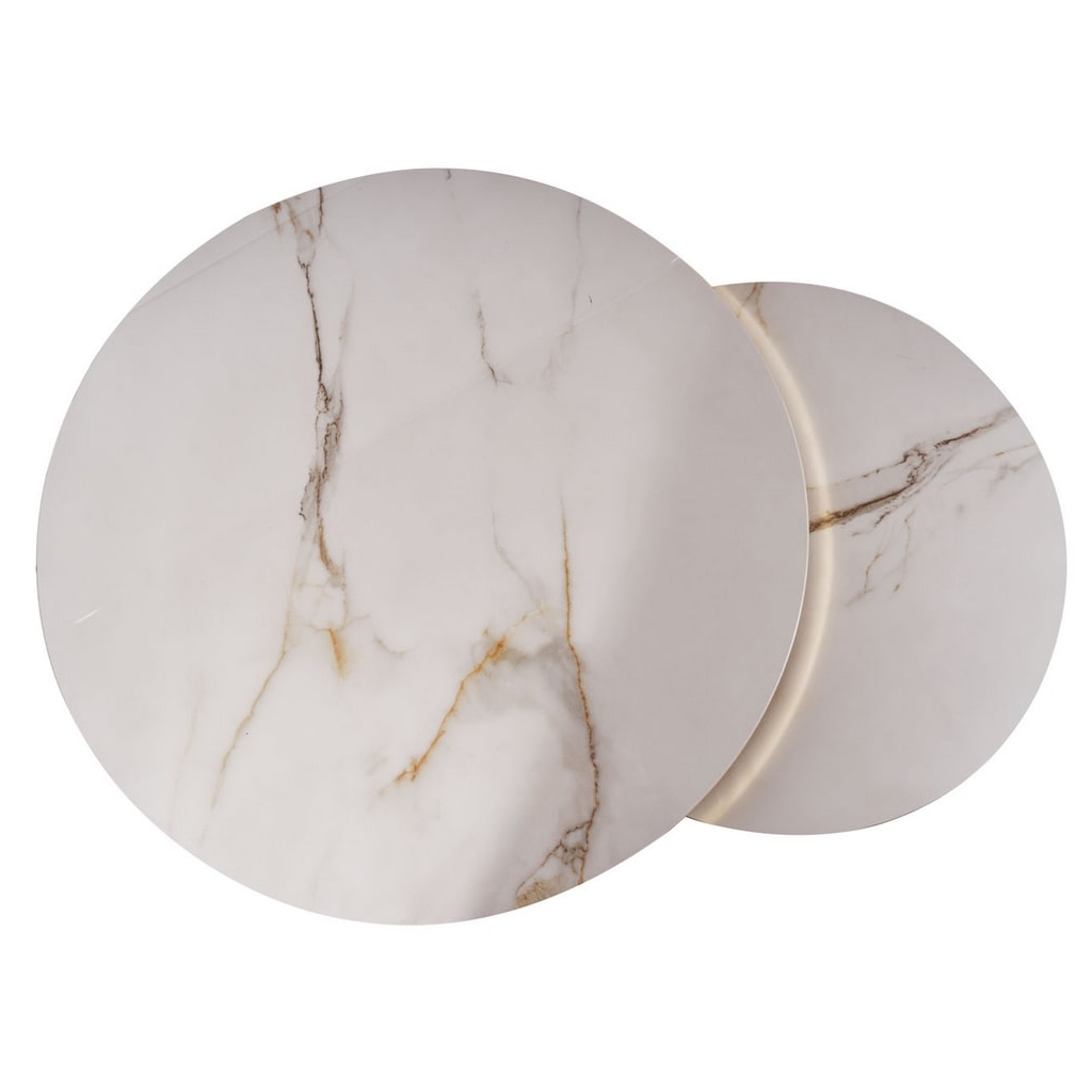 Oba stolíky majú kruhovú dosku z keramiky, ktorú nesú chrómované nohy z nerezu. Mramorovaná textúra dosky sa s lesklou podnožou vkusne dopĺňa a pôsobí exkluzívnym dojmom.