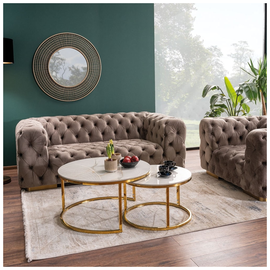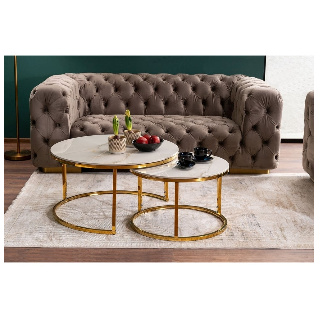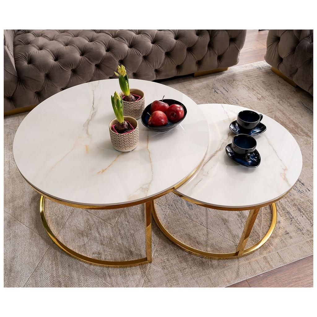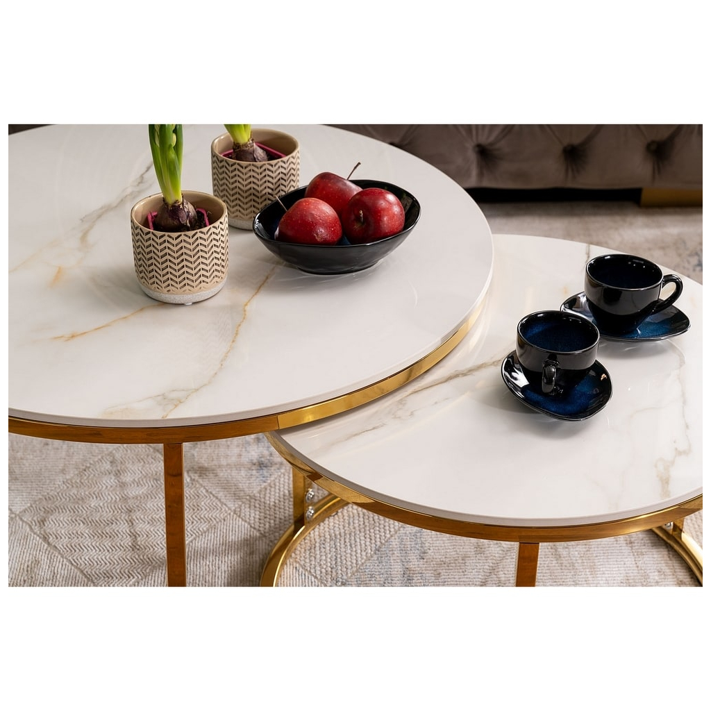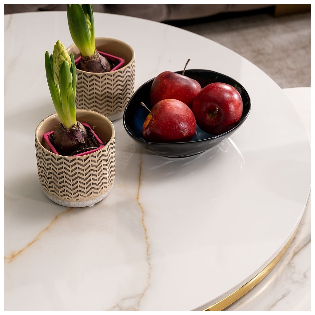 Oba stolíky majú kruhovú dosku z keramiky, ktorú nesú chrómované nohy z nerezu. Mramorovaná textúra dosky sa s lesklou podnožou vkusne dopĺňa a pôsobí exkluzívnym dojmom.