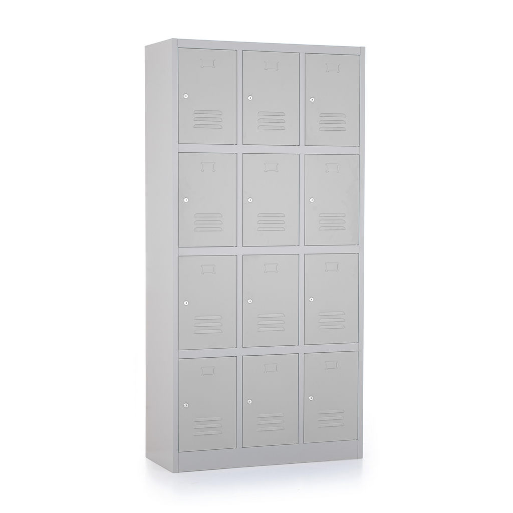 Kovová šatníková skrinka disponuje 12 samostatnými boxami v rozložení 3 × 4. Každý z nich ponúka dostatok úložného priestoru pre osobné veci i odevy.