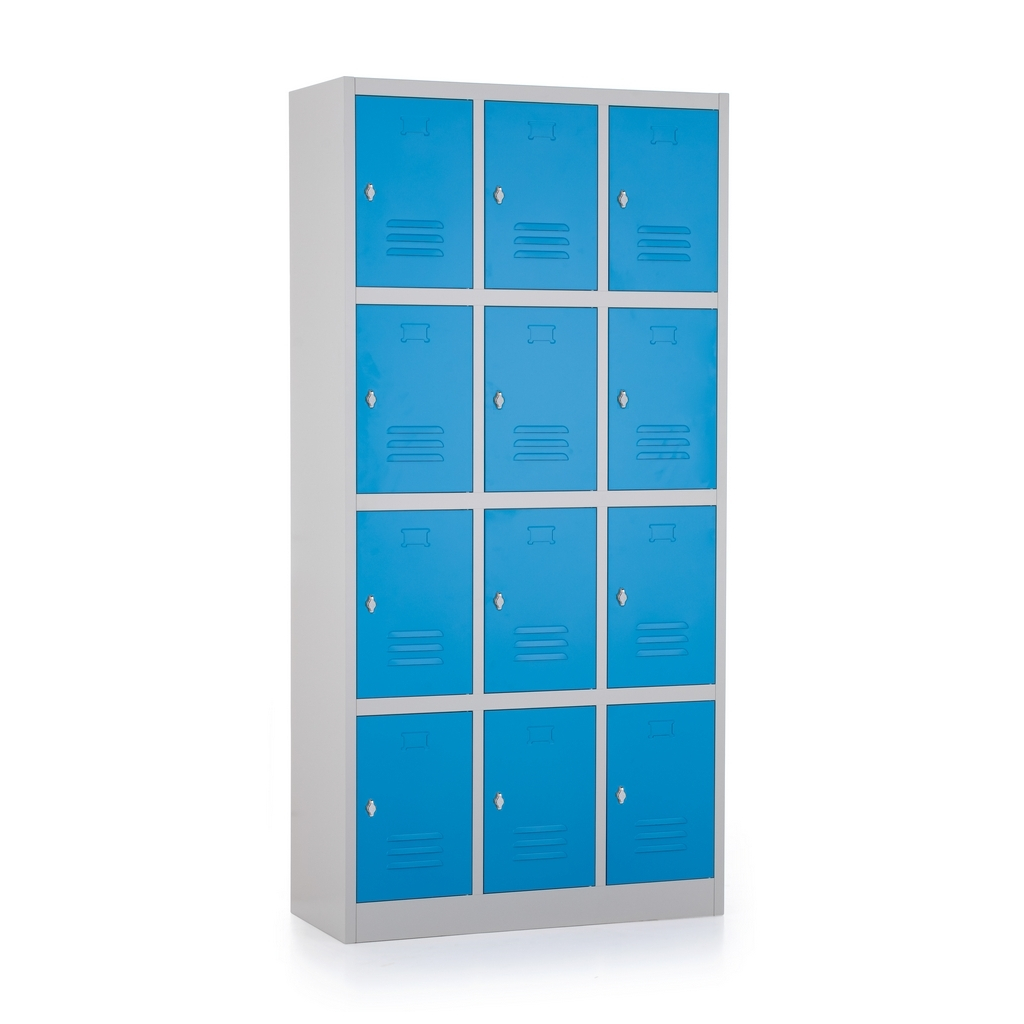 Kovová šatníková skrinka disponuje 12 samostatnými boxami v rozložení 3 × 4. Každý z nich ponúka dostatok úložného priestoru pre osobné veci i odevy.