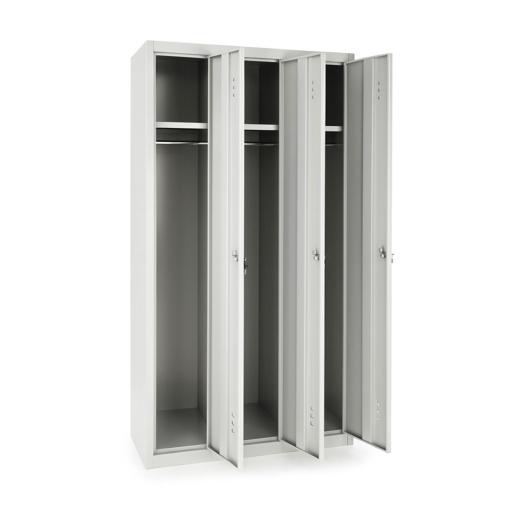 Kovová trojskrinka je ideálnym riešením pre hromadné šatne. Dá sa jednoducho prepojiť s ostatnými skrinami v priestore a zároveň vytvára dostatok priestoru na odkladanie nevyhnutných vecí.