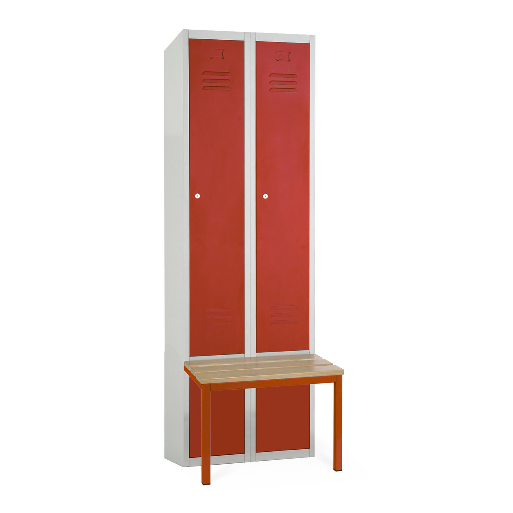 Kovová šatníková skrinka s lavičkou, 60 x 85 x 185 cm, sokel, cylindrický zámok, červená - ral 3000