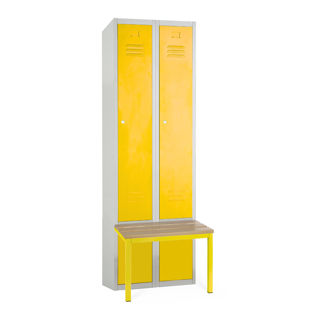 Kovová šatníková skrinka s lavičkou, 60 x 85 x 185 cm, sokel, cylindrický zámok, žltá - ral 1023