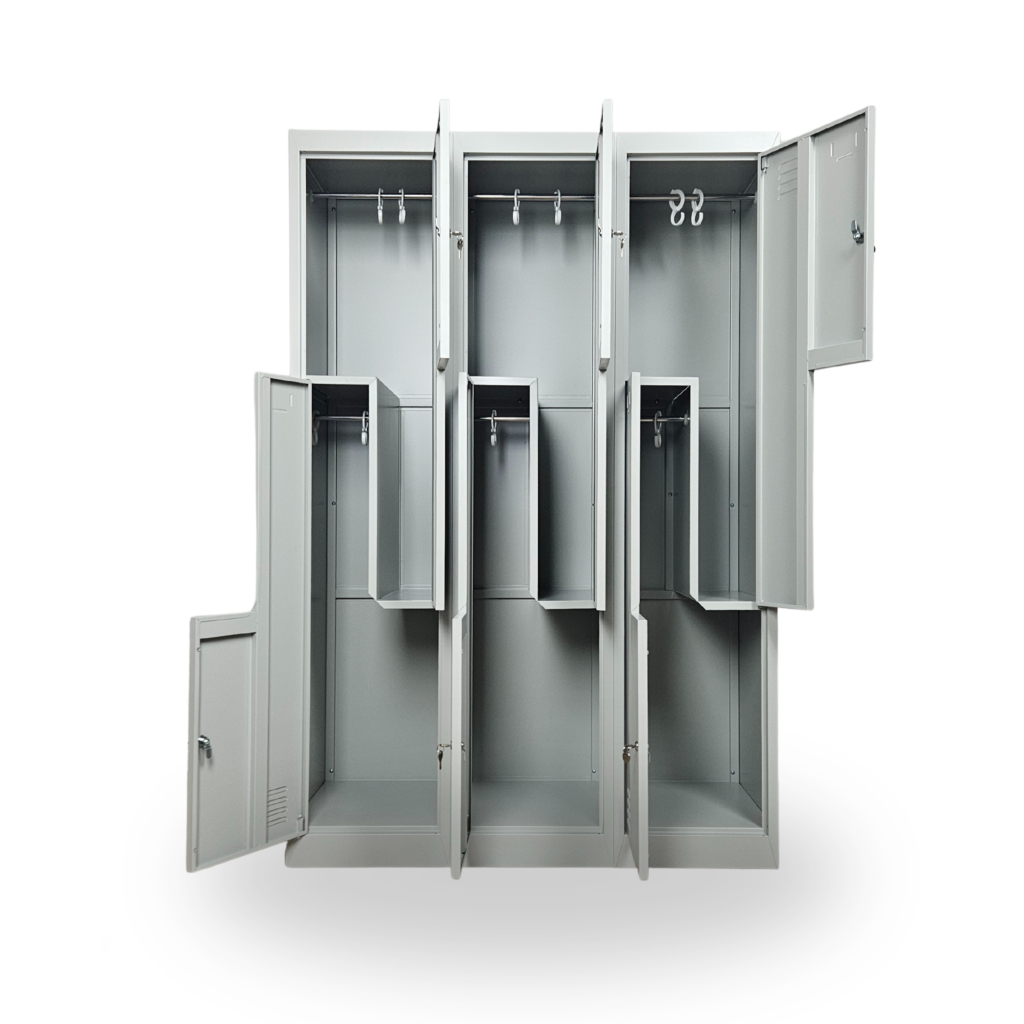 Všetky oddiely sú v hornej časti vybavené šatníkovou tyčou s 2 háčikmi. Na dvierkach nájdete držiaky na menovky a tiež prieduchy, ktoré zaistia vetranie.
