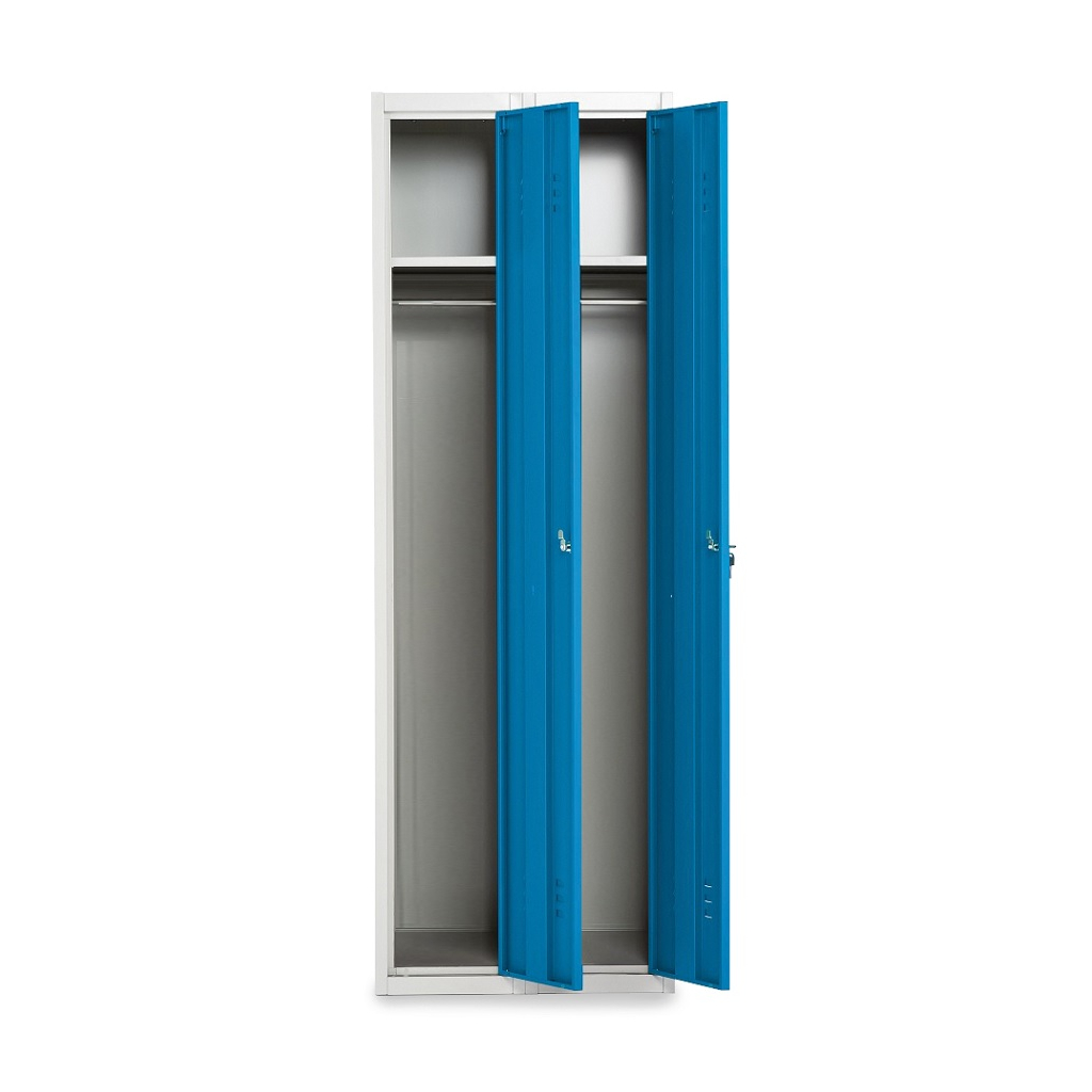 Kovová šatňová skrinka so šírkou 60 cm vám poskytne kombinovaný úložný priestor v podobe police, ktorá pri rovnomernom zaťažení unesie až 40 kg. Skrinka ďalej obsahuje v oboch svojich poloviciach kovový vešiak.