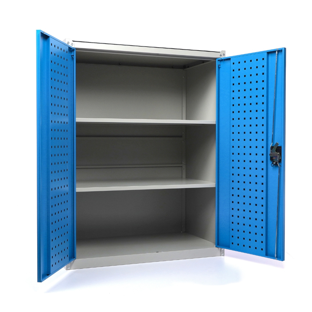 Táto kovová skriňa disponuje dvierkami s cylindrickým zámkom a perforáciou zvnútra, ktorú využijete na zavesenie náradia. Súčasťou balenia sú 2 kľúče k zámku.