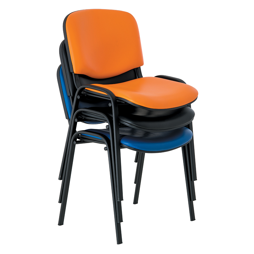 Stolička je skonštruovaná z oválnych oceľových trubiek. K tým sú pripevnené čierne plastové sedadlo a operadlo, ktoré sú čalúnené atraktívnou eko kožou. Nohy sú pri zemi ukončené plastovými krytkami proti poškodeniu podlahy. Nosnosť stoličky ISO je 120 kg a dodávame ju v 3 farebných prevedeniach.
