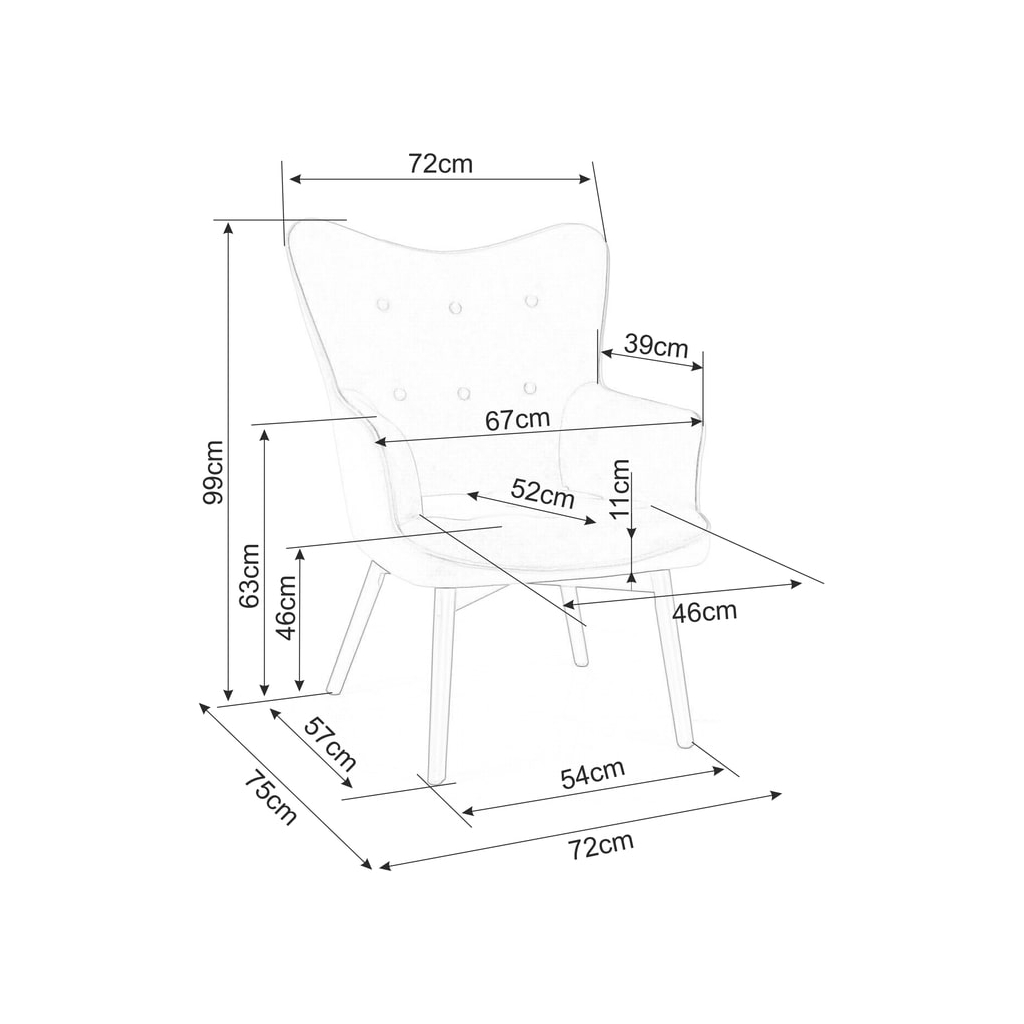 Rozmery celého kresla sú 72 × 75 × 99 cm (dĺžka × hĺbka × výška). Sedadlo je v pohodlnej výške 46 cm.