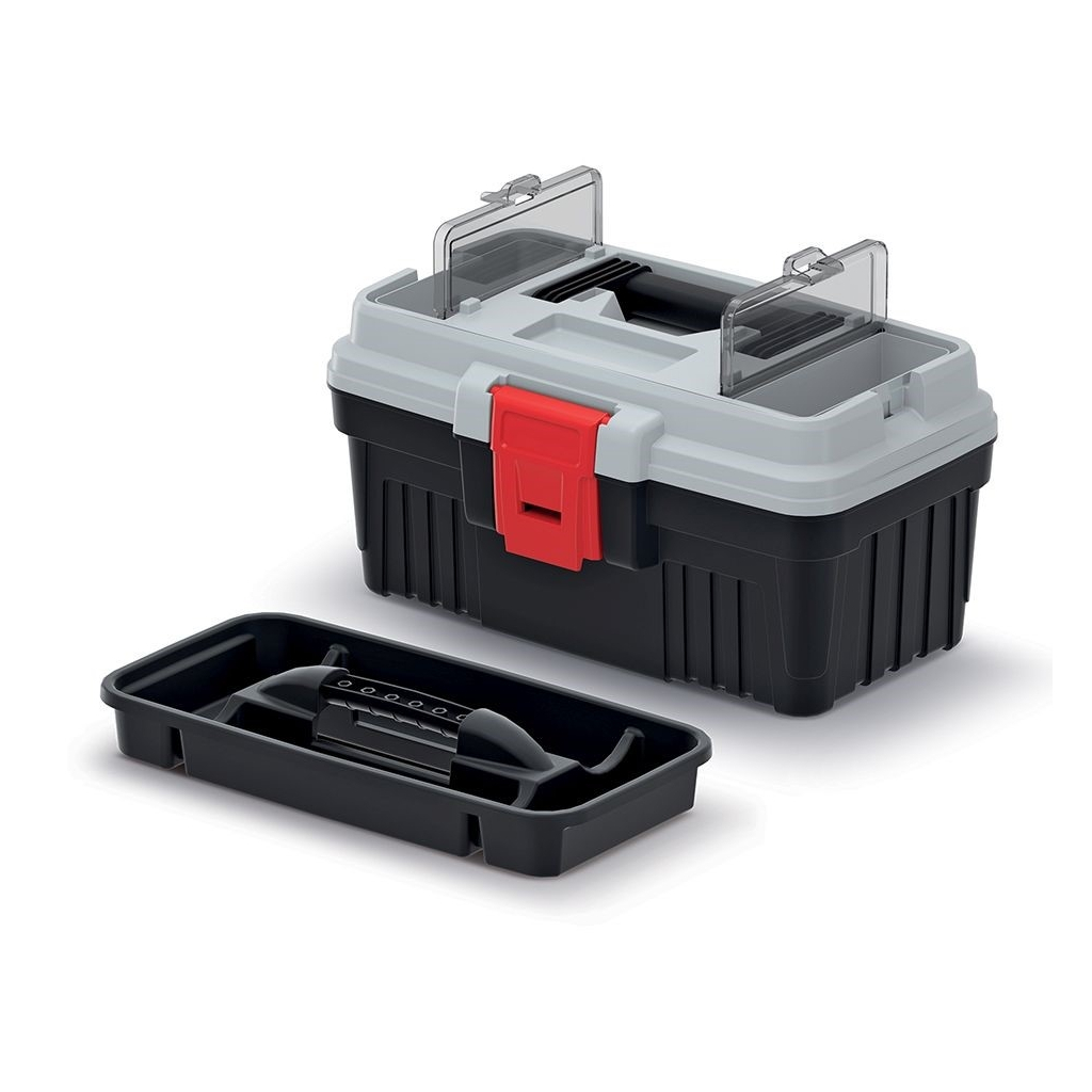 Tento jednoduchý kufor na náradie dobre poslúži každému majstrovi alebo údržbárovi. Celá konštrukcia je z tvrdeného plastu, čo schránke prepožičiava mechanickú odolnosť a nosnosť až 10 kg.