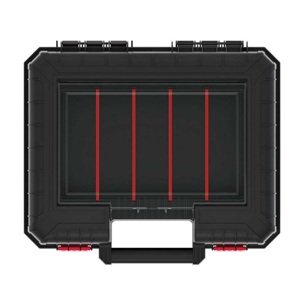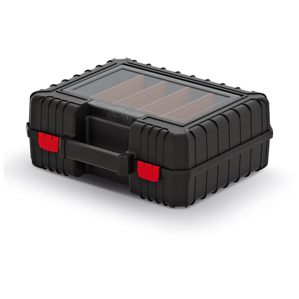 Vo veku kufríka je zabudovaný prepážkový organizér s robustným polykarbonátovým vekom pre prehľadné uloženie menšieho náčinia a súčiastok.