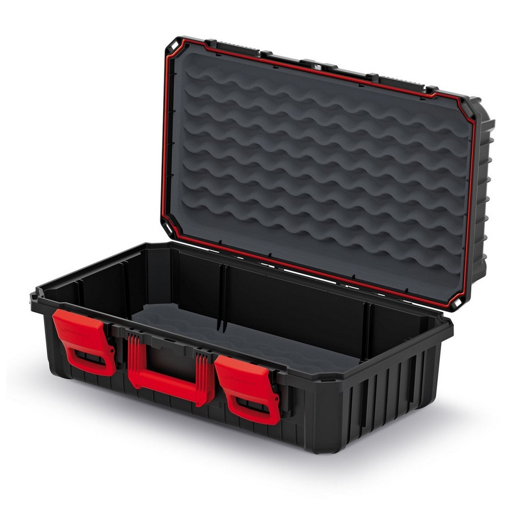 Na tento pevný kufor na náradie sa môžete spoľahnúť i v náročnejších podmienkach. Konštrukcia je z tvrdeného plastu a je rebrovaná, čo schránke prepožičiava vysokú mechanickú odolnosť a nosnosť až 25 kg.