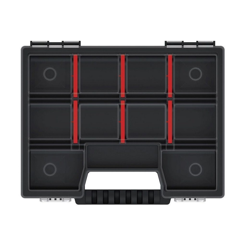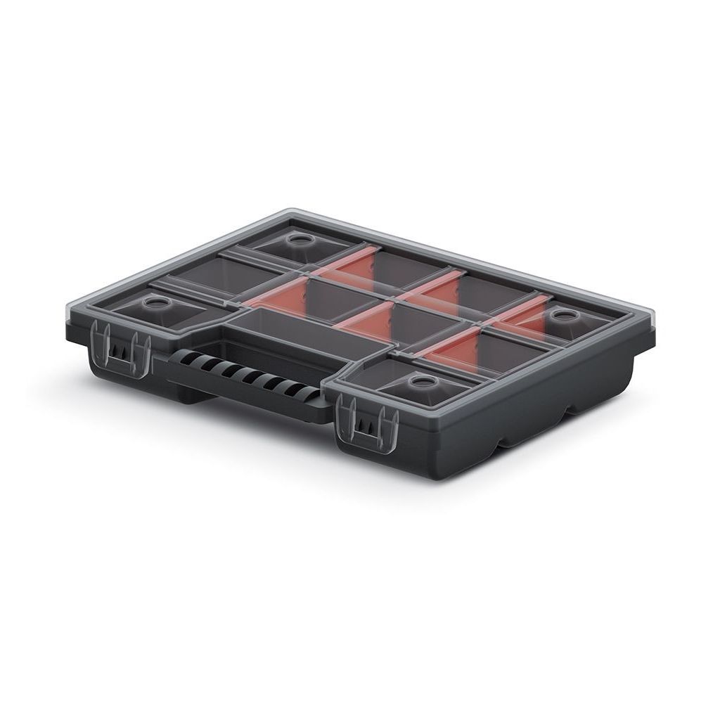 Organizéry predstavujú praktický spôsob, ako si udržať poriadok v drobnejšom náčiní a súčiastkach a zároveň ich mať vždy po ruke. Tento model je vybavený odnímateľnými prepážkami, pomocou ktorých si úložný priestor prispôsobíte presne na mieru. Priehľadné veko z odolného plastu vám zjednoduší hľadanie toho správneho dielu i bez nutnosti otvorenia.