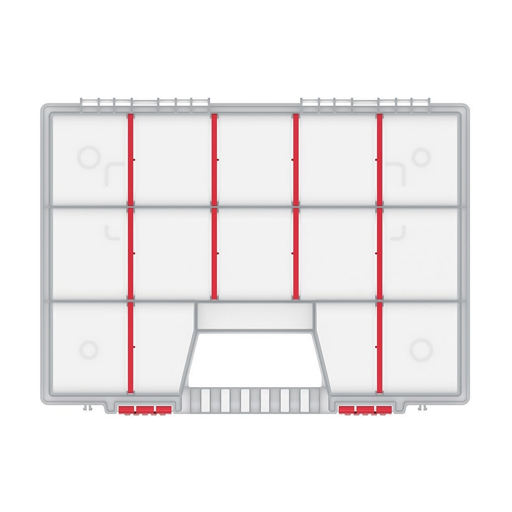 Organizéry predstavujú praktický spôsob, ako si udržať poriadok v drobnejšom náčiní a súčiastkach a zároveň ich mať vždy po ruke. Tento model je vybavený odnímateľnými prepážkami, pomocou ktorých si úložný priestor prispôsobíte presne na mieru. Priehľadné veko z odolného plastu vám zjednoduší hľadanie toho správneho dielu i bez nutnosti otvorenia.