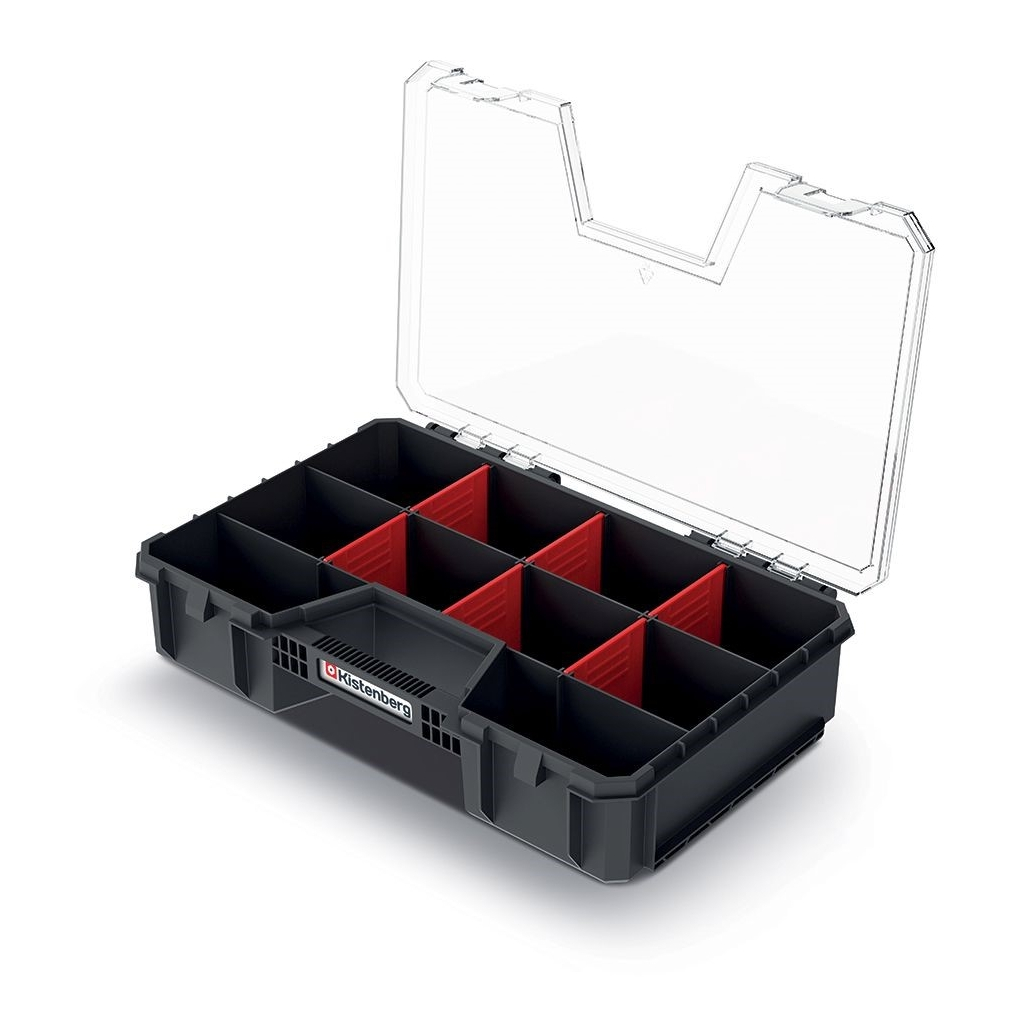 Organizéry predstavujú praktický spôsob, ako si udržať poriadok v drobnejšom náčiní a súčiastkach a zároveň ich mať vždy po ruke. Tento model je vybavený odnímateľnými prepážkami, pomocou ktorých si úložný priestor prispôsobíte presne na mieru. Priehľadné veko z odolného plastu vám zjednoduší hľadanie toho správneho dielu i bez nutnosti otvorenia.