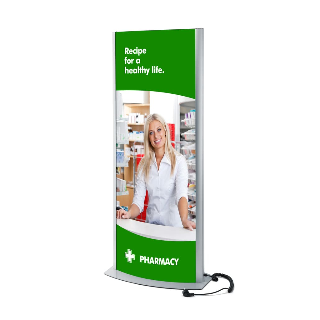 Svetelný totem ACTIVE veľkosti 2 x A1 je skvelým riešením pre prezentáciu reklamných oznámení, a to predovšetkým v interiéroch. Tento obojstranný moderný panel je vyrobený z kvalitného hliníka a je vybavený LED trubicami. Všetok obsah tak bude podsvietený a aj vďaka zaoblenému tvaru sa určite stane neprehliadnuteľným. Jednoduchosť svetelného totemu spočíva v zaklapávacom systéme, ktorý urýchľuje výmenu tlačovín, pretože prezentovaný obsah stačí len pohodlne vložiť.