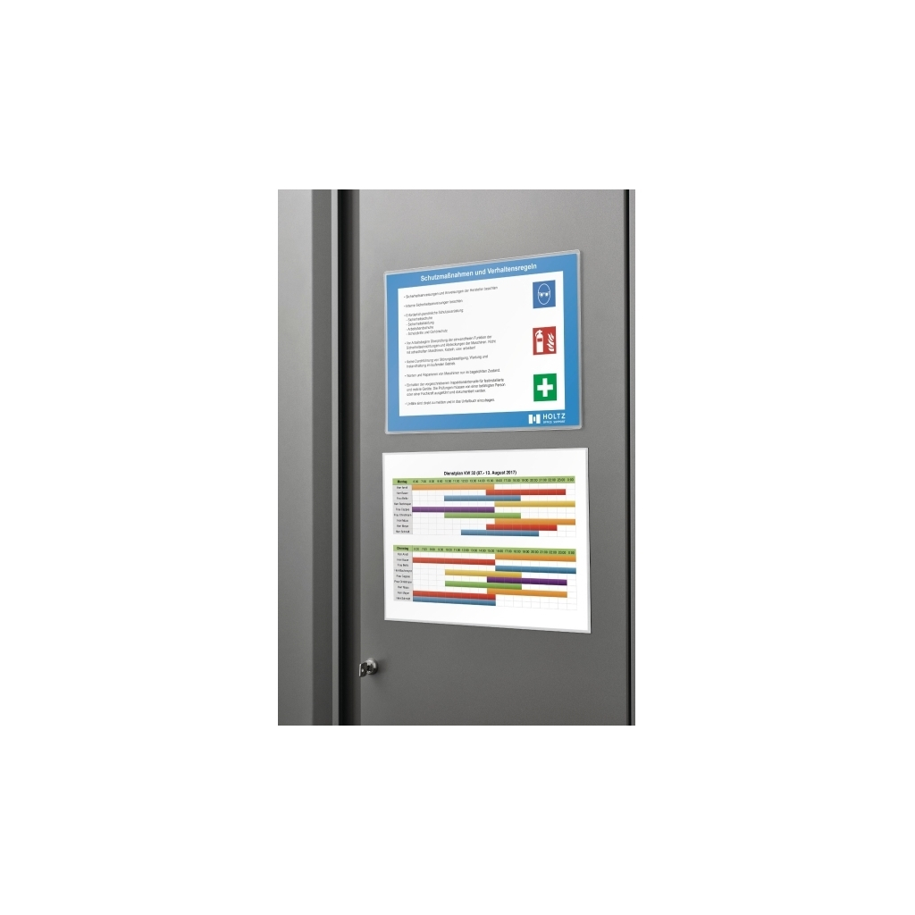 Magnetická kapsa Magnetoplan Magnetofix A4 slúží na vkladanie dokumentov a umiestnenie na magnetický povrch. Jej kapacita je až 15 listov formátu A4 orientovaných na šírku. Matný antireflexný povrch priesvitnej fólie chráni vložené dokumenty pred prachom a poškodením. Fólia je postrnách podlepená tenkou 1milimetrovou magnetickou páskou. Kapsu tak môžete umiestniť na magnetický povrch tabule či vitríny. Prilne ku všetkým železným povrchom. Dokument je možné jednoducho a rýchlo z kapsy vyňať a vymeniť.