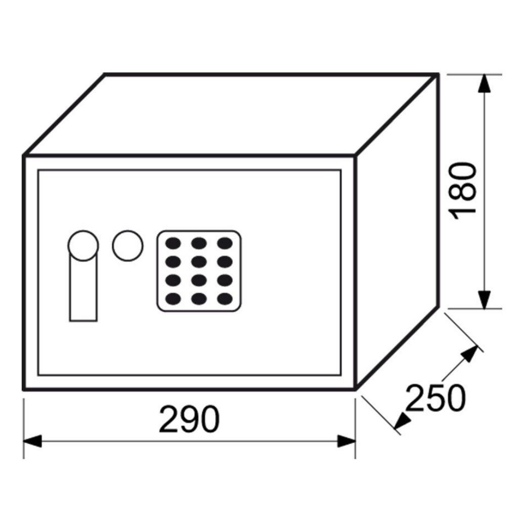 Sila dverí je 3 mm, plášť je silný 1 mm. Objem sejfu je 10,6 litra. Hmotnosť je 4,2 kg.