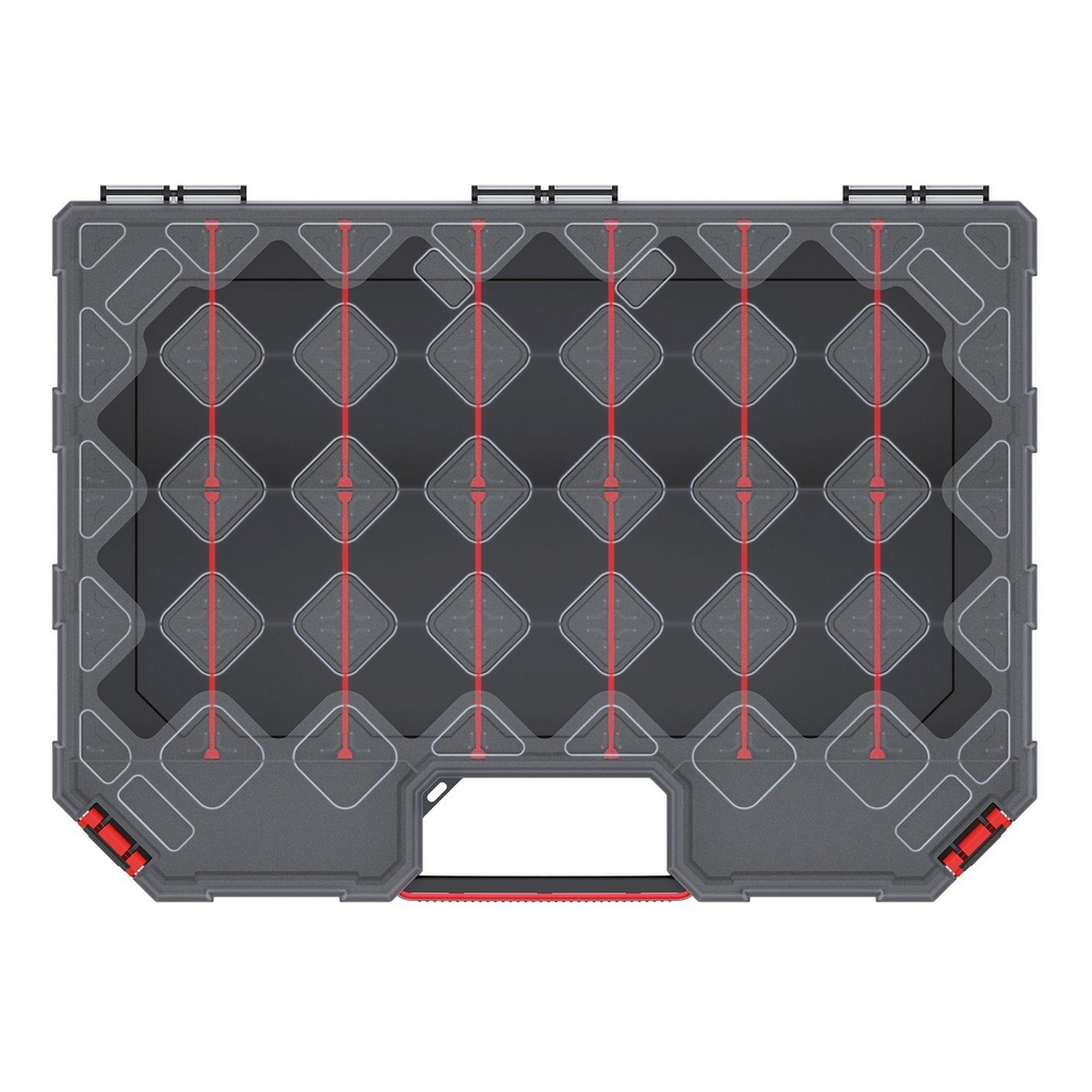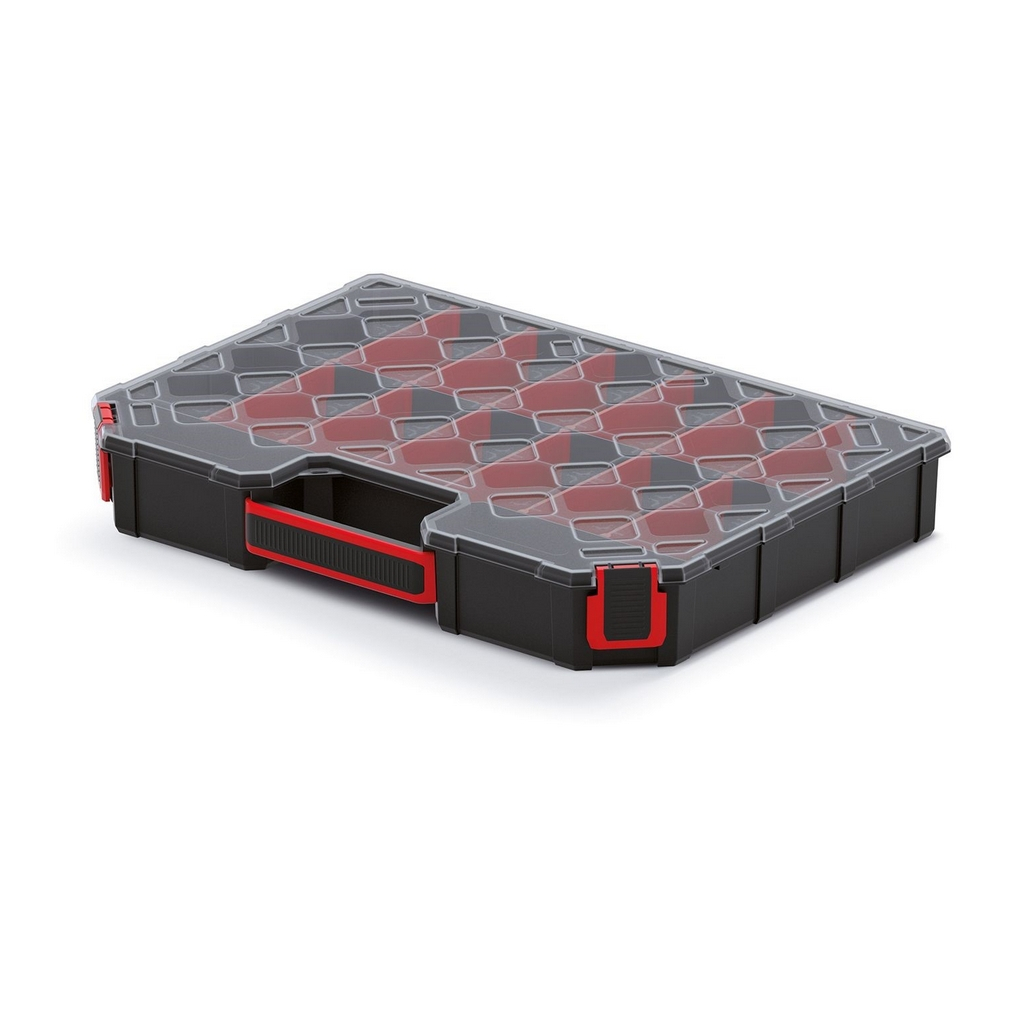 Organizéry predstavujú praktický spôsob, ako si udržať poriadok v drobnejšom náčiní a súčiastkach a zároveň ich mať vždy po ruke. Tento model je vybavený odnímateľnými prepážkami, pomocou ktorých si úložný priestor prispôsobíte presne na mieru. Priehľadné veko z polypropylénu vám uľahčí hľadanie toho správneho dielu aj bez nutnosti otvorenia.