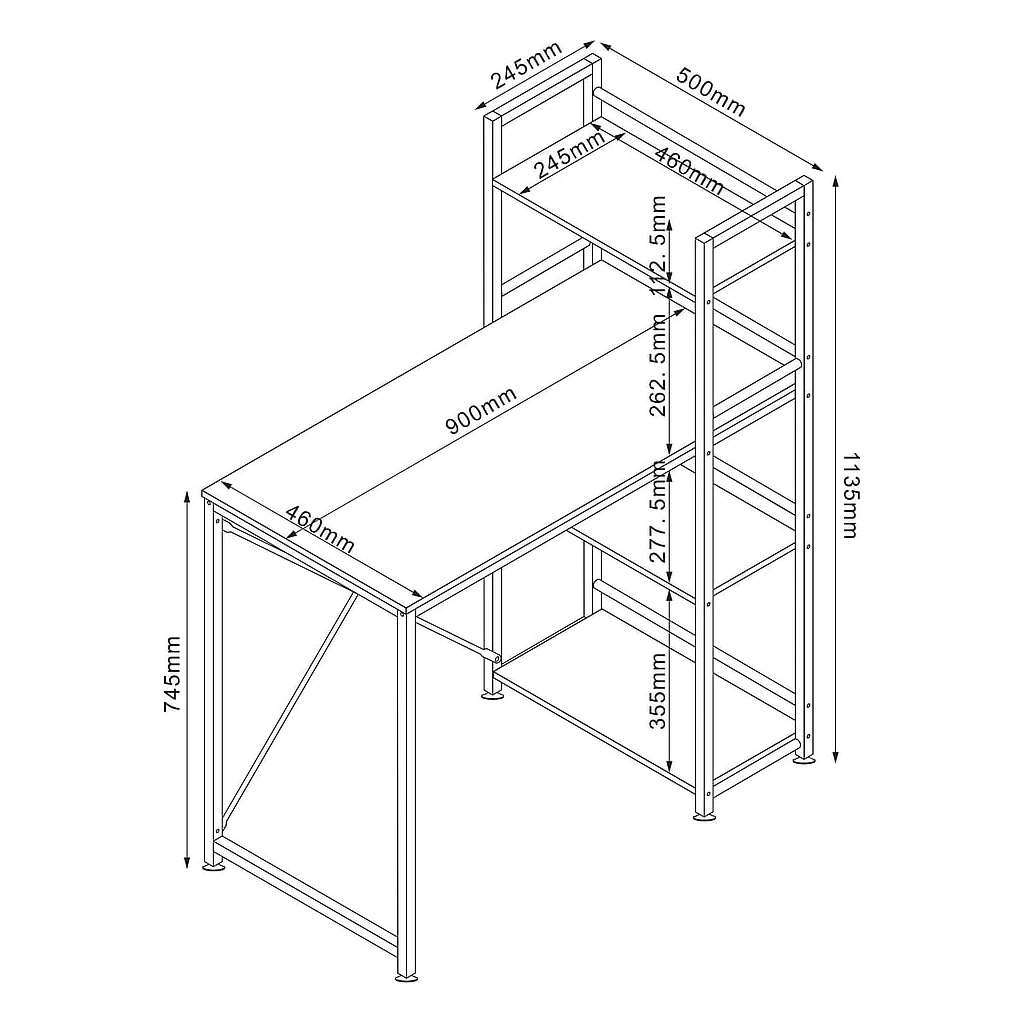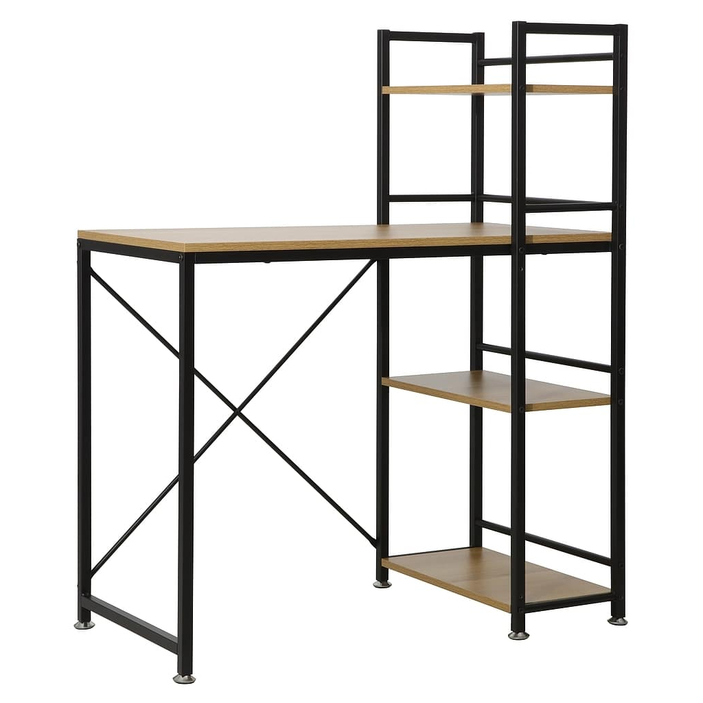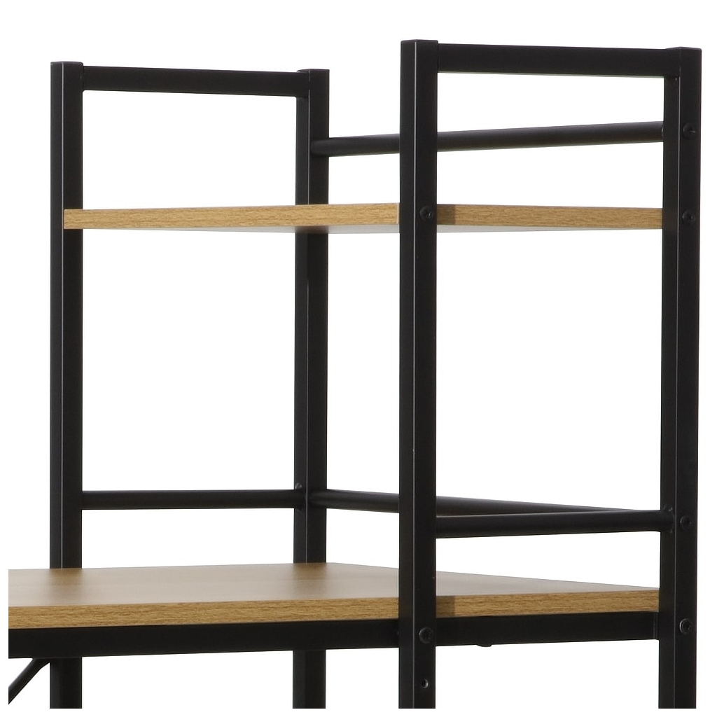 Doska stola a poličky sú z laminovanej drevotriesky, zvyšok konštrukcie potom z kovu v matne čiernej povrchovej úprave. Vďaka rektifikačným nôžkam bude stôl stabilný aj na podlahe, ktorá nie je dokonale rovná.