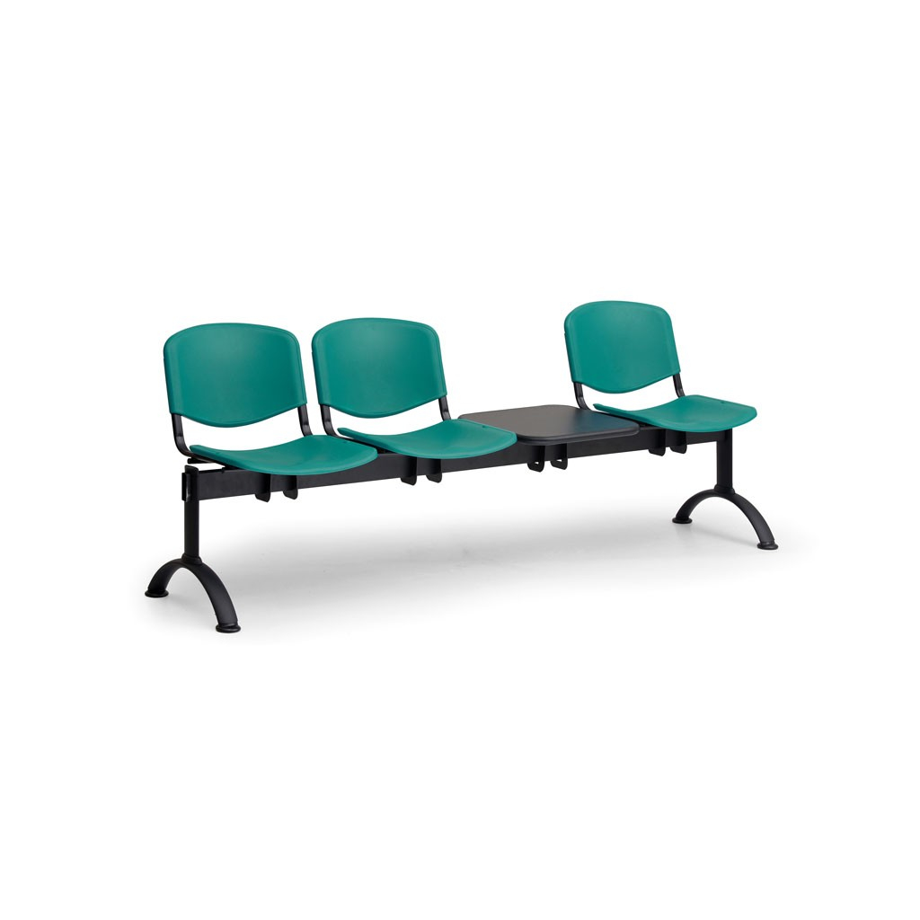 Plastová lavica ISO II v prevedení s čiernymi kovovými nohami a odkladacím stolíkom je skvelým vybavením do verejných priestorov, hál či najrôznejších typov čakární. Jednotlivé miesta na sedenie sú umiestnené na oceľovej konštrukcii. Sedadlo aj operadlo sú vyrobené z pevného plastu. Veľkou výhodou tohto materiálu je odolnosť proti poškodeniu a jednoduchá údržba.
