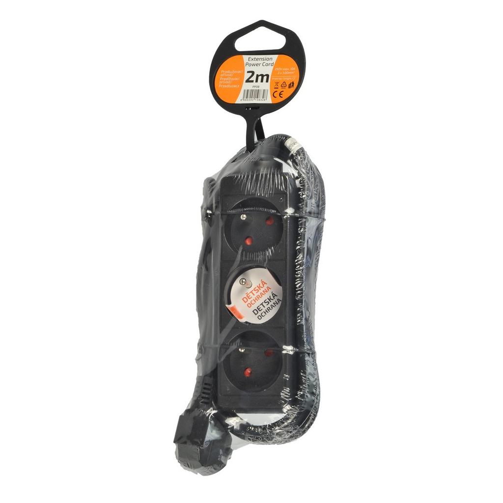 Predlžovací kábel vybavený vidlicou na jednom konci a tromi zásuvkami na druhom konci. Dĺžka kábla je 2 metre a prierez vodičov sa rovná 3 x 1,0 mm².